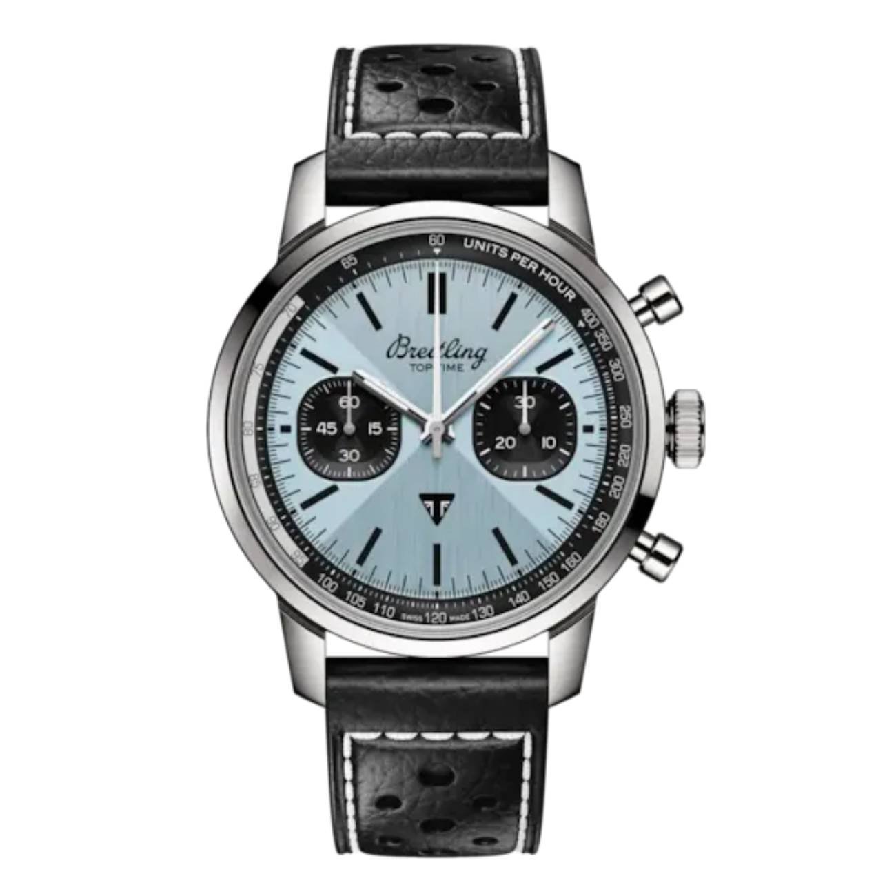 The Breitling Top Time series represents a revival of the brand’s iconic 1960s chronographs, with the Triumph edition paying homage to the legendary British motorcycle manufacturer. This collaboration celebrates the shared values of precision engineering and timeless design that define both brands. The 41mm stainless steel case maintains vintage proportions while housing the sophisticated Breitling 01 movement, known for its reliability and COSC-certified chronometer performance. The ice blue dial, a contemporary interpretation of classic racing colors, features excellent legibility with its clean index markers and contrasting sub-dials. The fixed bezel and 13.3mm case thickness create a streamlined profile that slips comfortably under shirt cuffs, while the black calfskin strap evokes the authentic feel of vintage racing gloves. Ideal for motorsport enthusiasts and collectors who appreciate mechanical sophistication, this chronograph excels as both a daily companion and a statement piece for special occasions. The 100-meter water resistance ensures practicality for active lifestyles, while the meticulous finishing reflects Breitling’s commitment to Swiss craftsmanship and attention to detail.