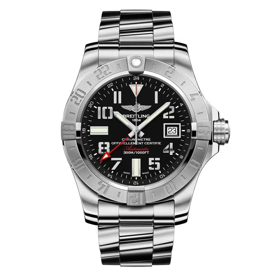 Breitling Avenger II GMT Watches. 43.00 mm stainless steel case, screw-locked crown, bidirectional ratcheted bezel, sapphire crystal with glareproof treatment on both sides, Volcano black dial with Arabic numerals, selfwinding mechanical Breitling 32 movement with second time zone (24 hr) and date display, approximately 42 hours of power reserve, stainless steel Professional III bracelet. Water resistant to 300 m (1000 ft).