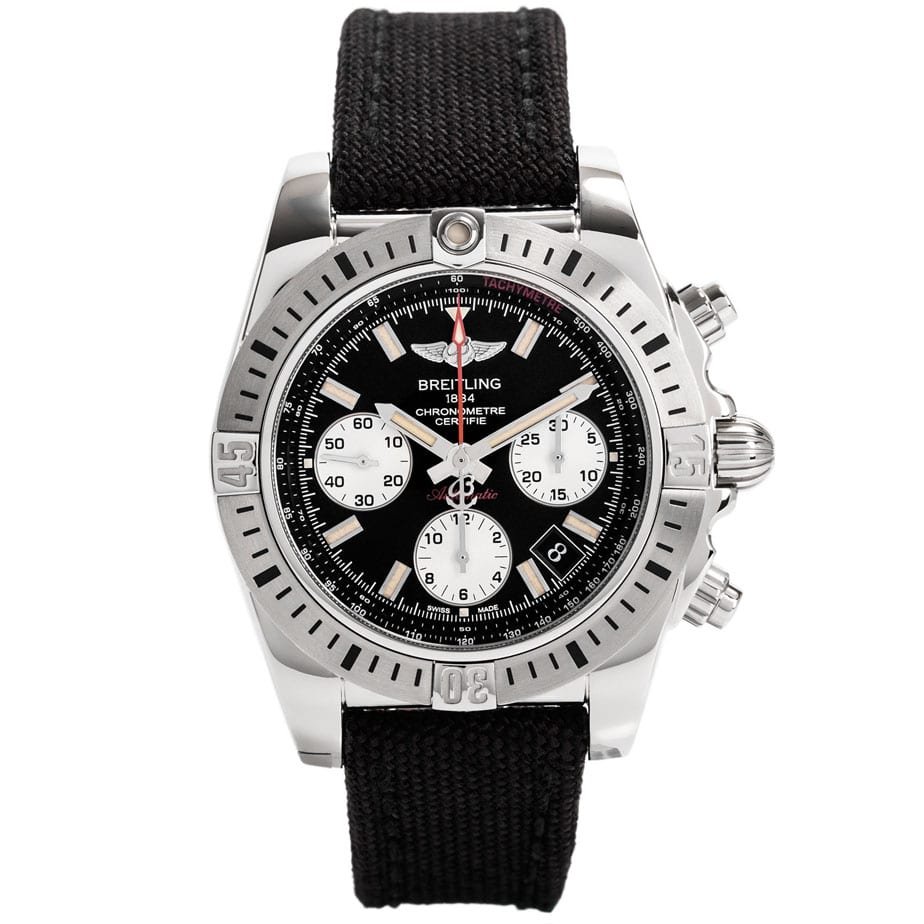 Onyx black dial with silver subdials, selfwinding mechanical Breitling 01 movement with date display, chronograph function, 70 hours of power reserve, black military strap with deployant buckle. Water resistant to 300 m (1000 ft).
