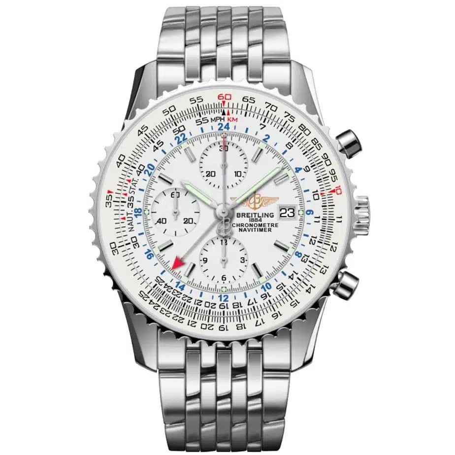 Breitling Navitimer Navitimer World Watches. 46.00 mm stainless steel case, screwed in back, non screw-locked crown with two gaskets, bidirectional bezel with slide rule, cambered sapphire crystal with glareproof treatment on both sides, silver dial, selfwinding mechanical Breitling 24 movement with date display, chronograph function, 2nd timezone (24 hr), approximately 42 hours of power reserve, stainless steel Navitimer bracelet.