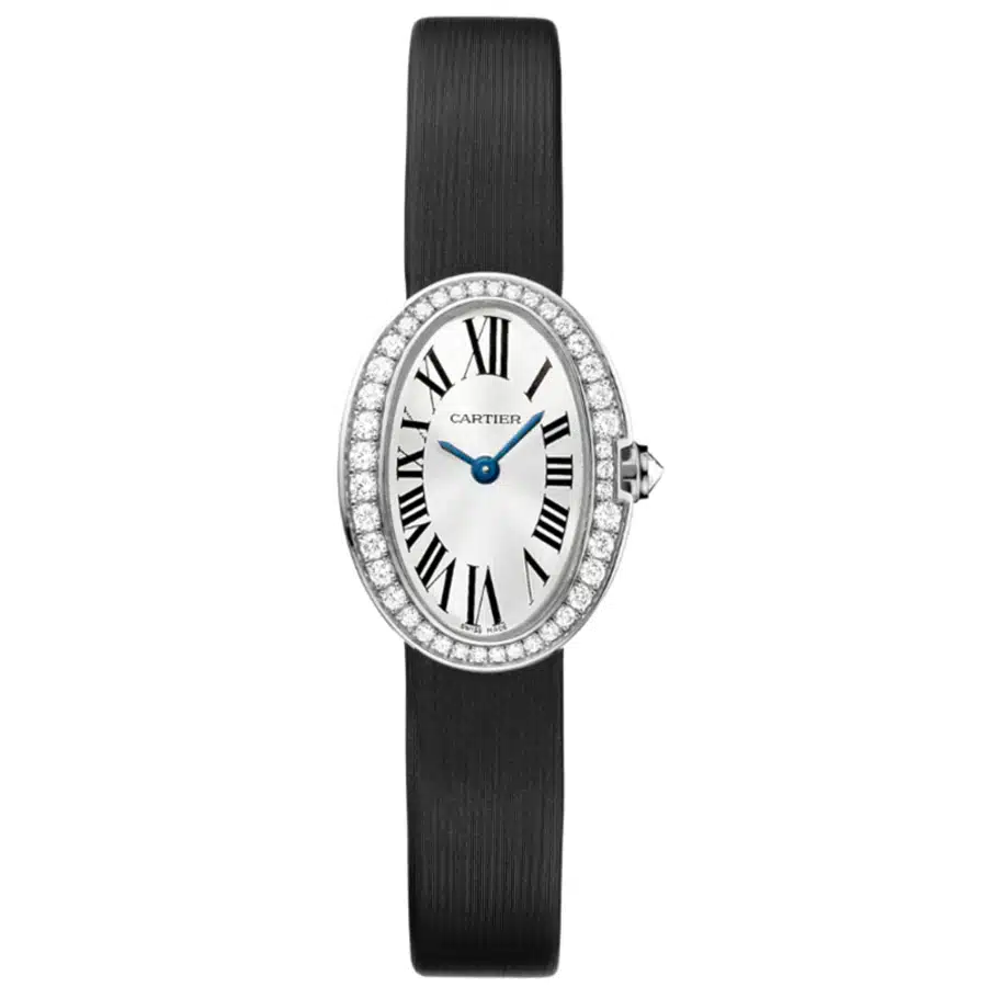 The Cartier Baignoire collection, first introduced in 1912, represents one of the maison’s most enduring and distinctive designs, inspired by the elegant oval shape of a bathtub (‘baignoire’ in French). This 2024 iteration continues the tradition with exceptional craftsmanship, featuring a rhodiumized 18K white gold case meticulously set with round diamonds that catch light from every angle. The silvered sunray finish dial creates a captivating play of light, while the Roman numerals and blued-steel hands pay homage to Cartier’s signature aesthetic codes. The quartz caliber 059 movement ensures precise timekeeping with minimal maintenance, making it ideal for daily wear. Perfect for formal events, gala dinners, or as a statement piece for the sophisticated woman who appreciates both jewelry artistry and horological precision. The combination of diamond-set white gold and black satin creates a striking contrast that transitions seamlessly from daytime elegance to evening glamour, embodying the perfect balance between Cartier’s jewelry heritage and watchmaking expertise.