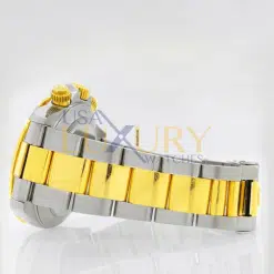 Rolex Oyster Perpetual Daytona 40 mm 18k Yellow Gold and Stainless Steel with fixed 18k Yellow Gold Bezel with Engraved Tachymetric Scale and Champagne Dial with Luminous Golden Hands and luminous Hour Markers. Screw-Down Crown and two Screw-Down push-buttons, three Chronograph Sub-Dials with Arabic numerals. The watch has Oyster 18k Yellow Gold and Stainless Steel bracelet with Oyster Clasp. The Zenith automatic movement with inverted “6” in middle sub-dial. Made in Switzerland.