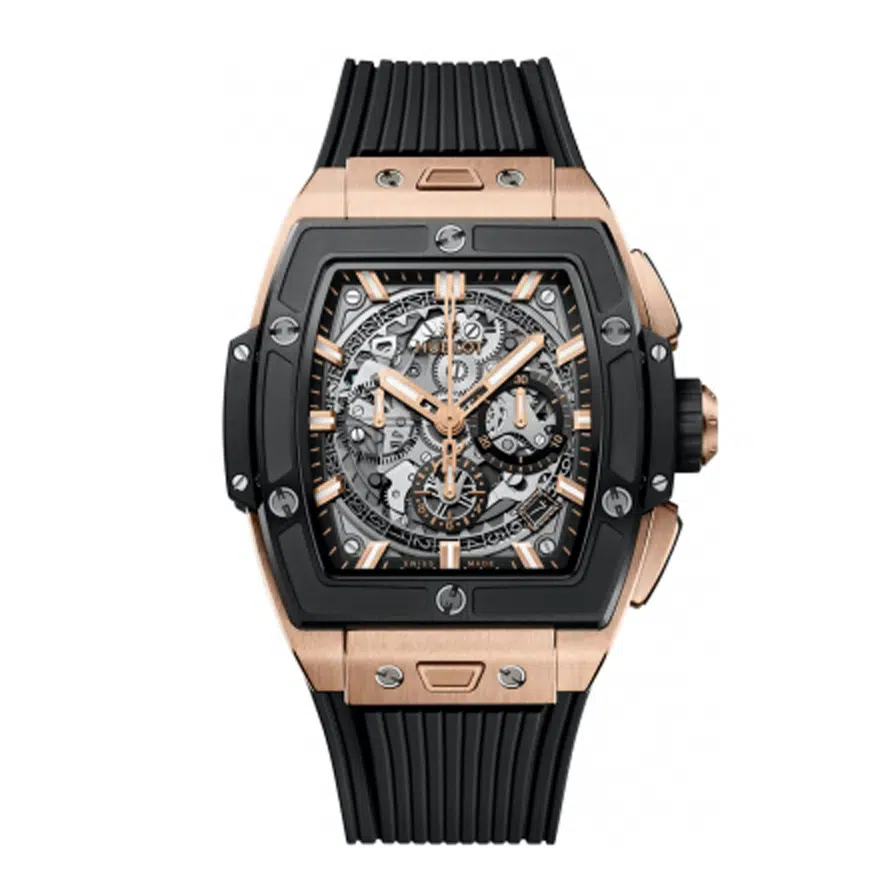 The Hublot Big Bang 42 mm (ref. 642-OM-0180-RX) features an automatic movement; black skeleton dial with luminescent markers index markings, luminescent hands dial; sapphire-crystal, transparent case back; and 42 mm, 18k rose gold case on a leather strap with a 18k rose gold folding clasp.