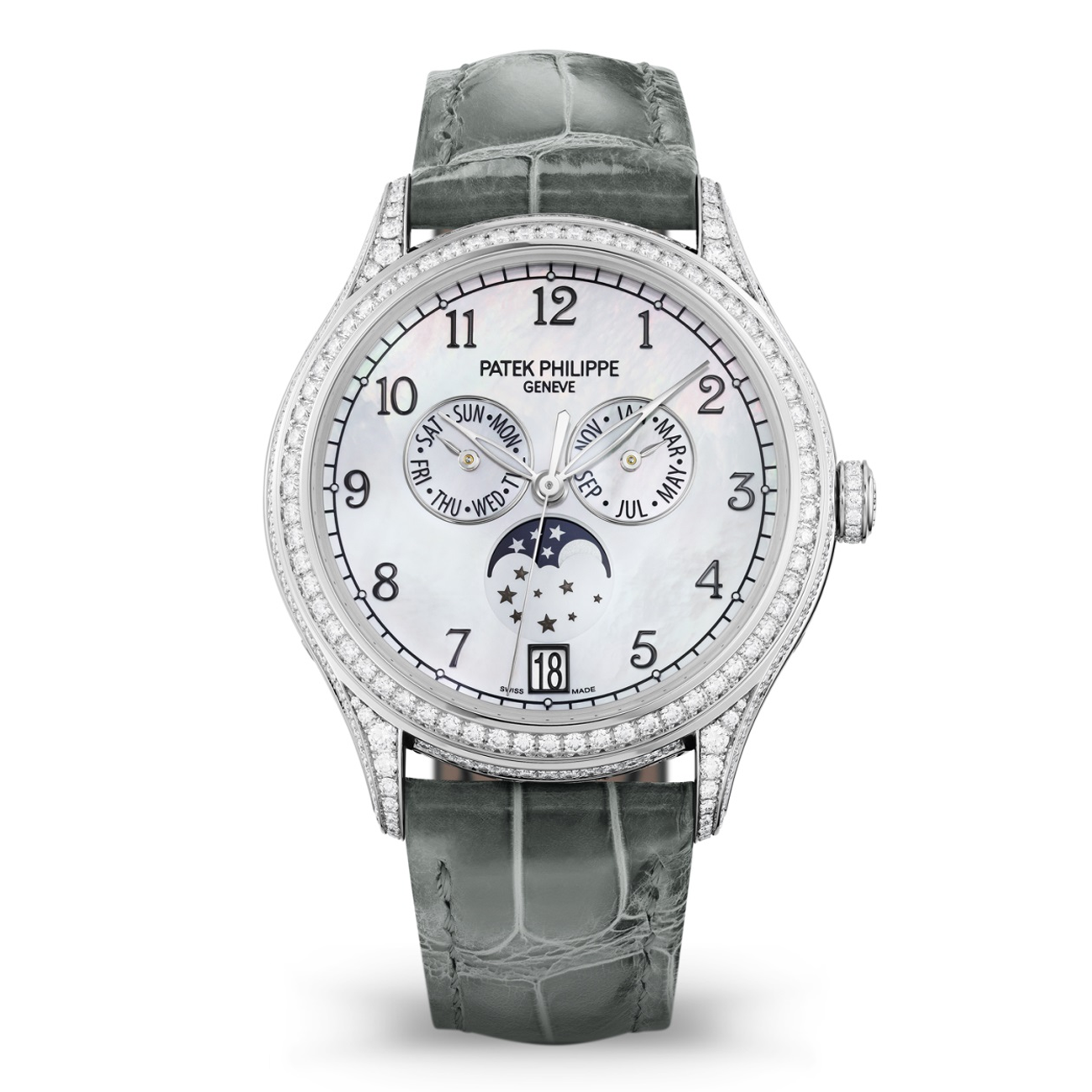 The Patek Philippe Complications 4948G-010 exemplifies the brand’s commitment to creating timepieces destined to become family heirlooms. As part of the esteemed Complications collection, this model showcases Patek Philippe’s mastery of both technical innovation and aesthetic refinement. The annual calendar mechanism, a signature complication introduced by the manufacture in 1996, represents a perfect balance between practical functionality and mechanical sophistication, requiring just one annual adjustment while maintaining exceptional precision. The white Balinese mother-of-pearl dial, carefully selected for its unique iridescence, provides a stunning backdrop for the gold-applied numerals and delicate hands. The 38mm white gold case, meticulously set with 347 diamonds, demonstrates the brand’s jewelry expertise while maintaining perfect proportions for both formal and sophisticated casual occasions. This timepiece is ideally suited for collectors who appreciate understated luxury, technical excellence, and the enduring value that comes with Patek Philippe ownership. The sapphire crystal case back offers a captivating view of the meticulously finished movement, allowing appreciation of the craftsmanship that has defined the brand since 1839. As a complete set with original documentation, this watch represents not just a timekeeping instrument but a legacy piece that transcends generations.
