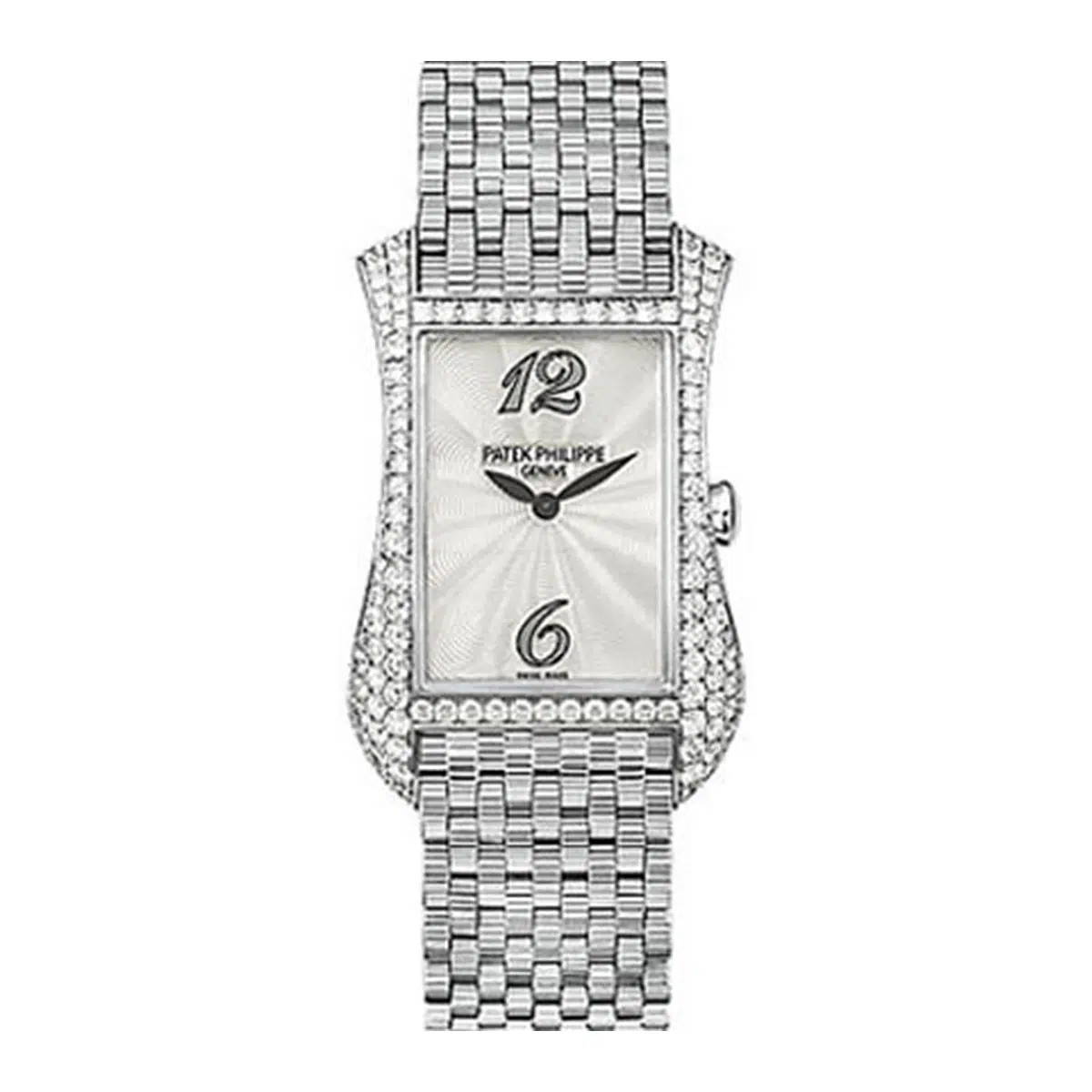 The Patek Philippe Gondolo (ref. 4972/1G-001) features an automatic movement; silver dial; sapphire-crystal, transparent case back; and 27.4 X 39.7 mm, 18k white gold and diamonds case on a 18k white gold strap with an 18k white gold folding clasp.