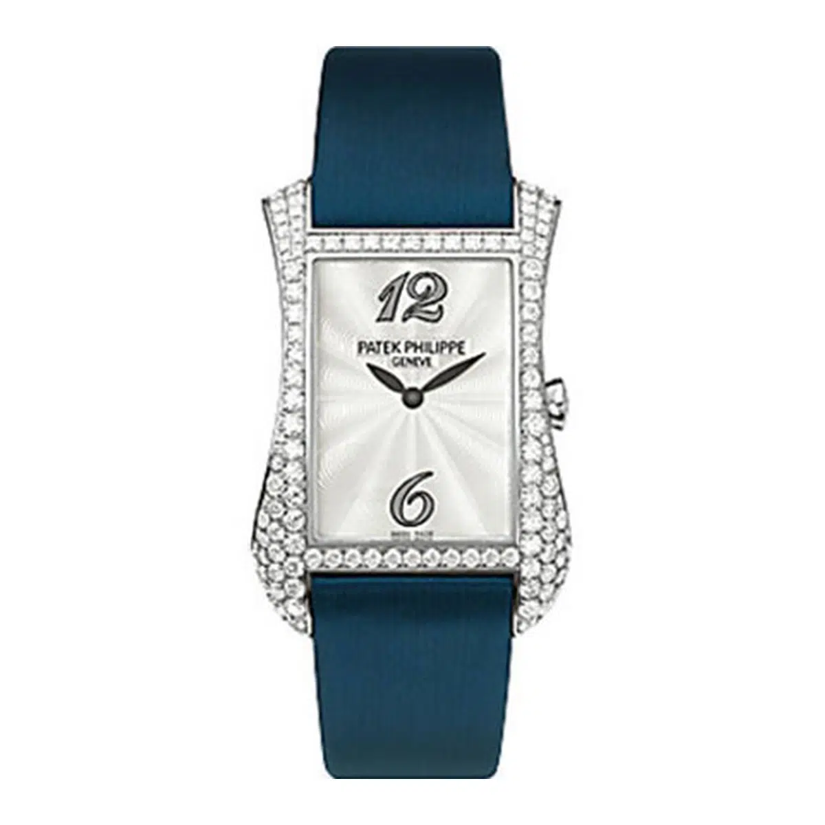 The Patek Philippe Gondolo (ref. 4972G-001) features an automatic movement; silver dial; sapphire-crystal, transparent case back; and 27.4 X 39.7 mm, 18k white gold and diamonds case on a satin strap with an 18k white gold folding clasp.