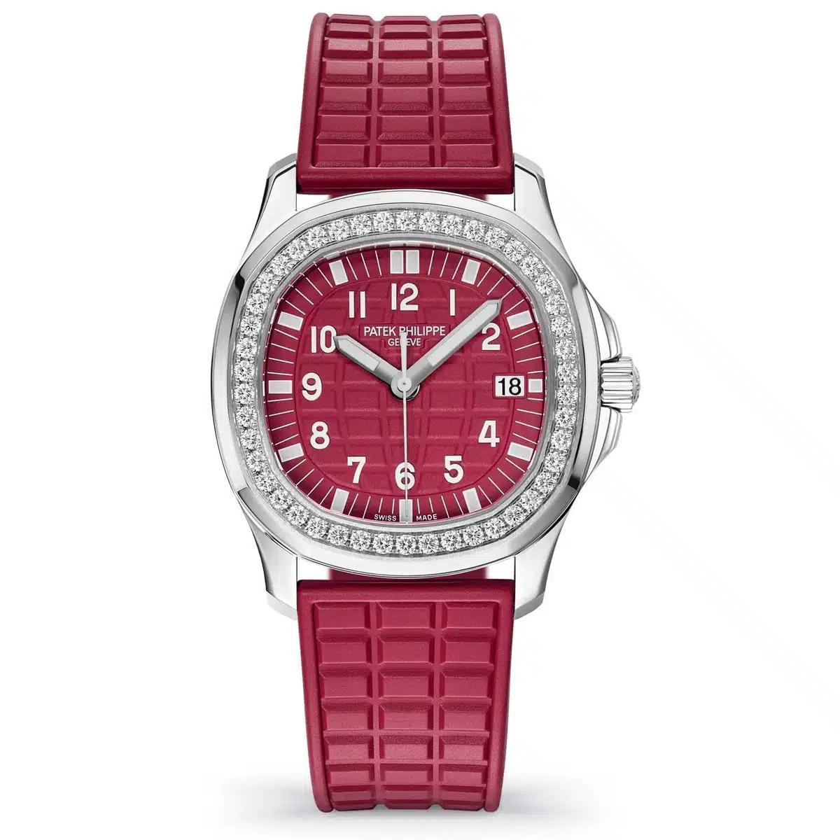 The Patek Philippe Aquanaut (ref. 5067A-027) features an quartz movement; pink dial; sapphire-crystal, transparent case back; and 35 mm, stainless steel case on a rubber strap with an stainless steel double folding clasp.