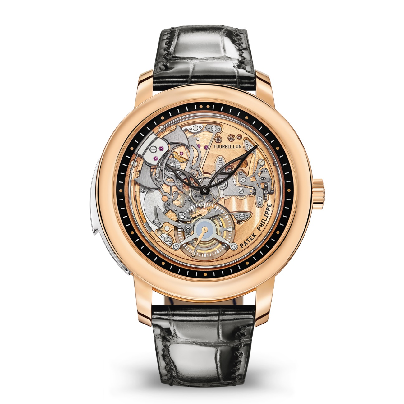 The Patek Philippe Grand Complications 5303R stands as a testament to the brand’s unwavering dedication to horological perfection. This exceptional timepiece combines three of watchmaking’s most prestigious complications: a minute repeater that chimes the time with cathedral-like resonance, a tourbillon that counters gravitational effects on precision, and a skeletonized dial that offers an unprecedented view of the mechanical ballet within. The transparent sapphire dial represents a bold departure from tradition while maintaining Patek Philippe’s signature elegance. Crafted for formal occasions and discerning collectors, this watch serves as both a precision instrument and a wearable work of art. The rose gold case with white gold engraved inserts demonstrates the brand’s mastery of precious metals, while the black alligator strap provides a classic counterpoint to the technical sophistication. As part of Patek Philippe’s esteemed Grand Complications collection, the 5303R continues the brand’s 180-year legacy of creating timepieces meant to be passed through generations, embodying the philosophy that one never actually owns a Patek Philippe but merely cares for it for the next generation.