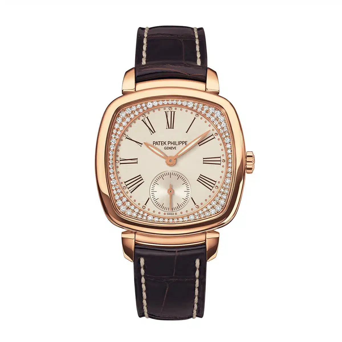The Patek Philippe Gondolo (ref. 7041R-001) features an mechanical movement; cream dial; sapphire-crystal, transparent case back; and 30 mm, 18k rose gold case on a leather strap with an 18k rose gold folding clasp.