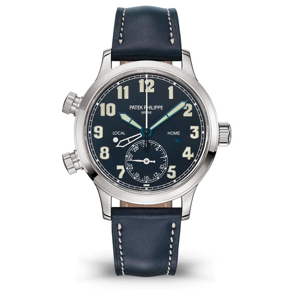 The Patek Philippe Calatrava (ref. 7234G-001) features an automatic movement; blue dial; sapphire-crystal, transparent case back; and 37.50 mm, 18k white gold case on a leather strap with an 18k white gold folding clasp.