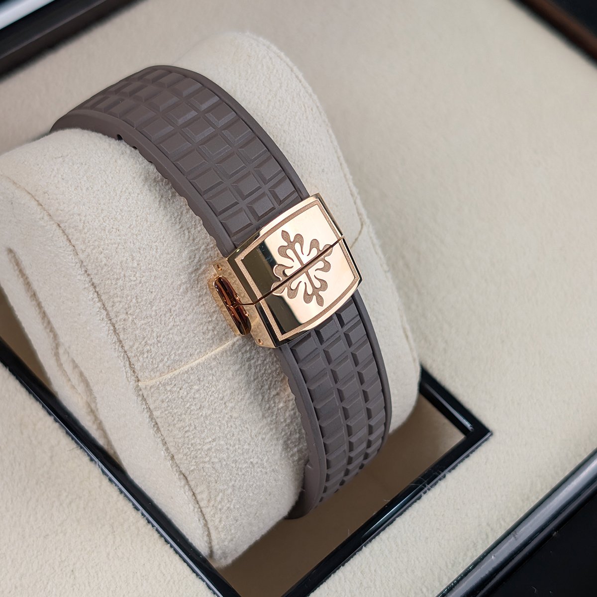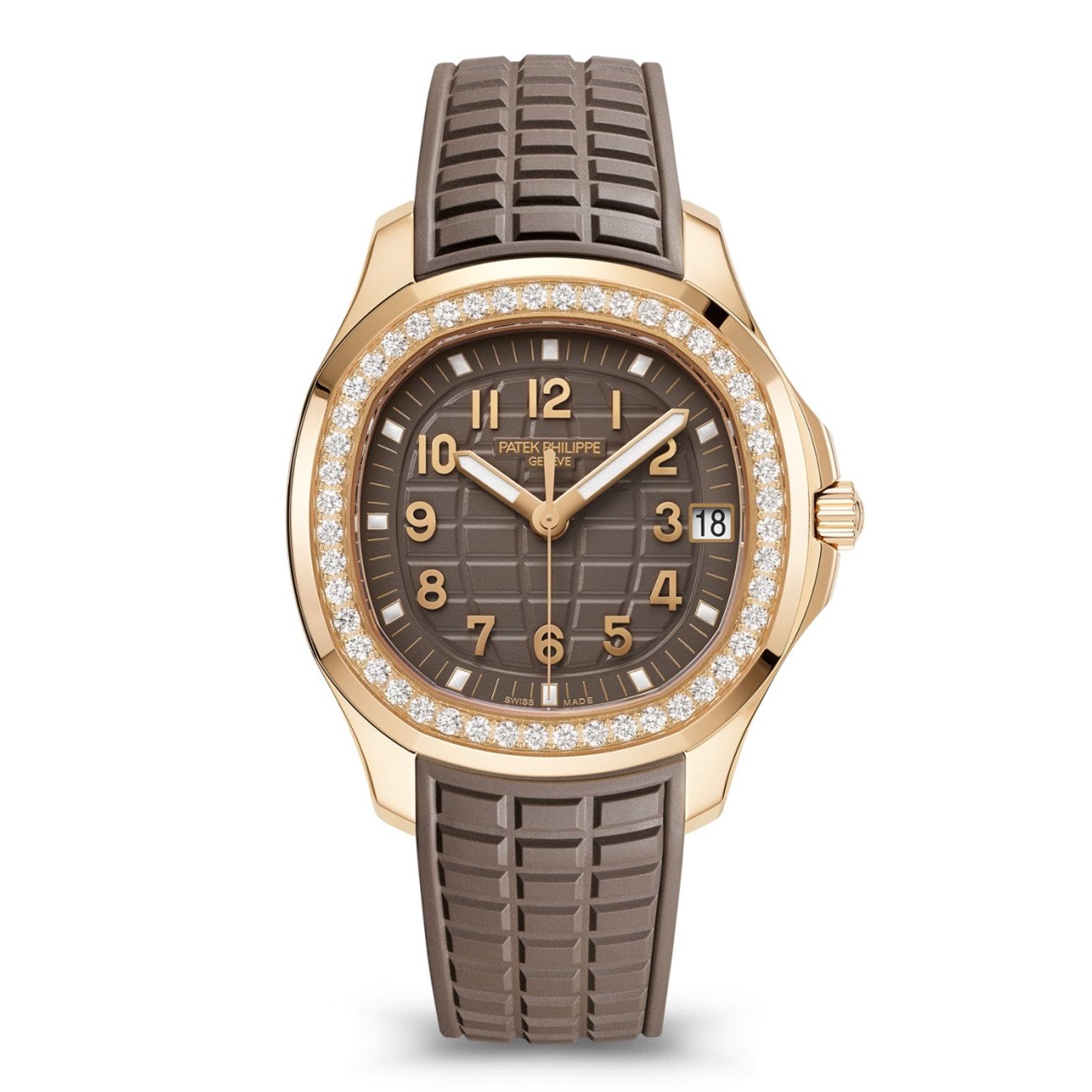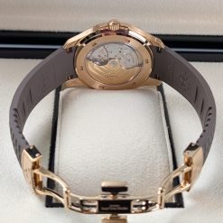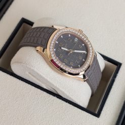 The Patek Philippe Aquanaut collection, introduced in 1997, represents the brand’s modern interpretation of luxury sports watches while maintaining the house’s commitment to exceptional craftsmanship. The 5268/200R-010 model exemplifies this philosophy with its elegant 38.8mm rose gold case that masterfully combines polished and satin-brushed surfaces, creating a play of light that enhances its sophisticated presence. The rounded octagonal bezel, set with 48 brilliant-cut diamonds, adds a touch of luxury without compromising the watch’s sporty character. The warm taupe dial features the distinctive Aquanaut embossed pattern, providing excellent legibility through its Arabic numerals and luminescent hands. Powered by the advanced Caliber 26-330 S C/430, this self-winding movement incorporates Patek Philippe’s latest technical innovations including the Gyromax® balance and Spiromax® balance spring for superior precision. The matching composite strap, developed specifically for the Aquanaut line, offers exceptional durability and comfort for daily wear. This timepiece transitions seamlessly from casual daytime occasions to elegant evening events, making it an ideal companion for the modern collector who appreciates both technical excellence and aesthetic refinement. As with all Patek Philippe creations, this watch is designed to become a cherished heirloom, representing the brand’s commitment to creating timepieces that transcend generations.