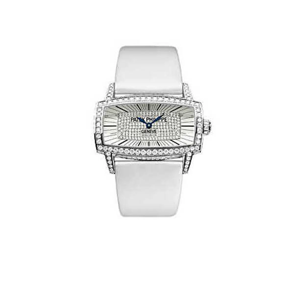 The Patek Philippe Gondolo (ref. 4982G-001) features an quartz movement; diamonds dial; sapphire-crystal, transparent case back; and 37×22 mm, 18k white gold case on a leather strap with a 18k white gold folding clasp.