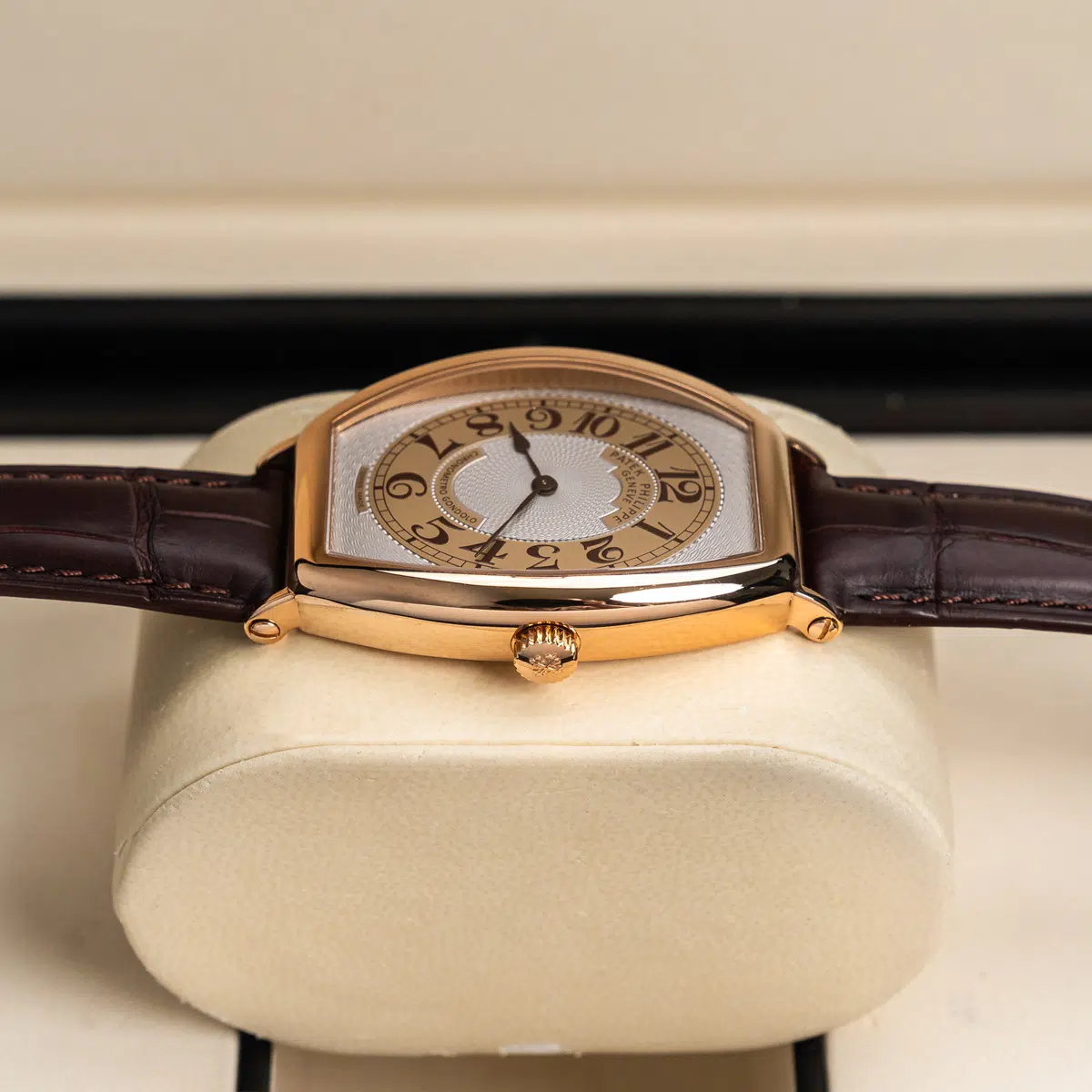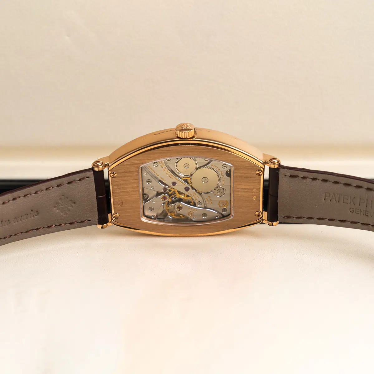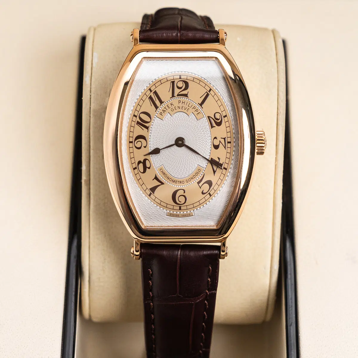 The Patek Philippe Gondolo (ref. 5098R-001) features an mechanical movement; silver dial; sapphire-crystal, transparent case back; and 42×32 mm, 18k rose gold case on a leather strap with a 18k rose gold folding clasp.