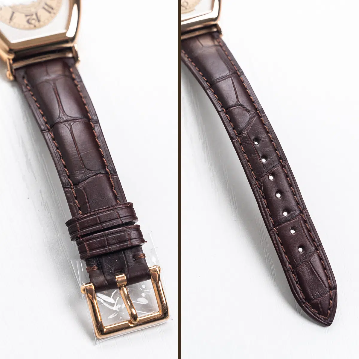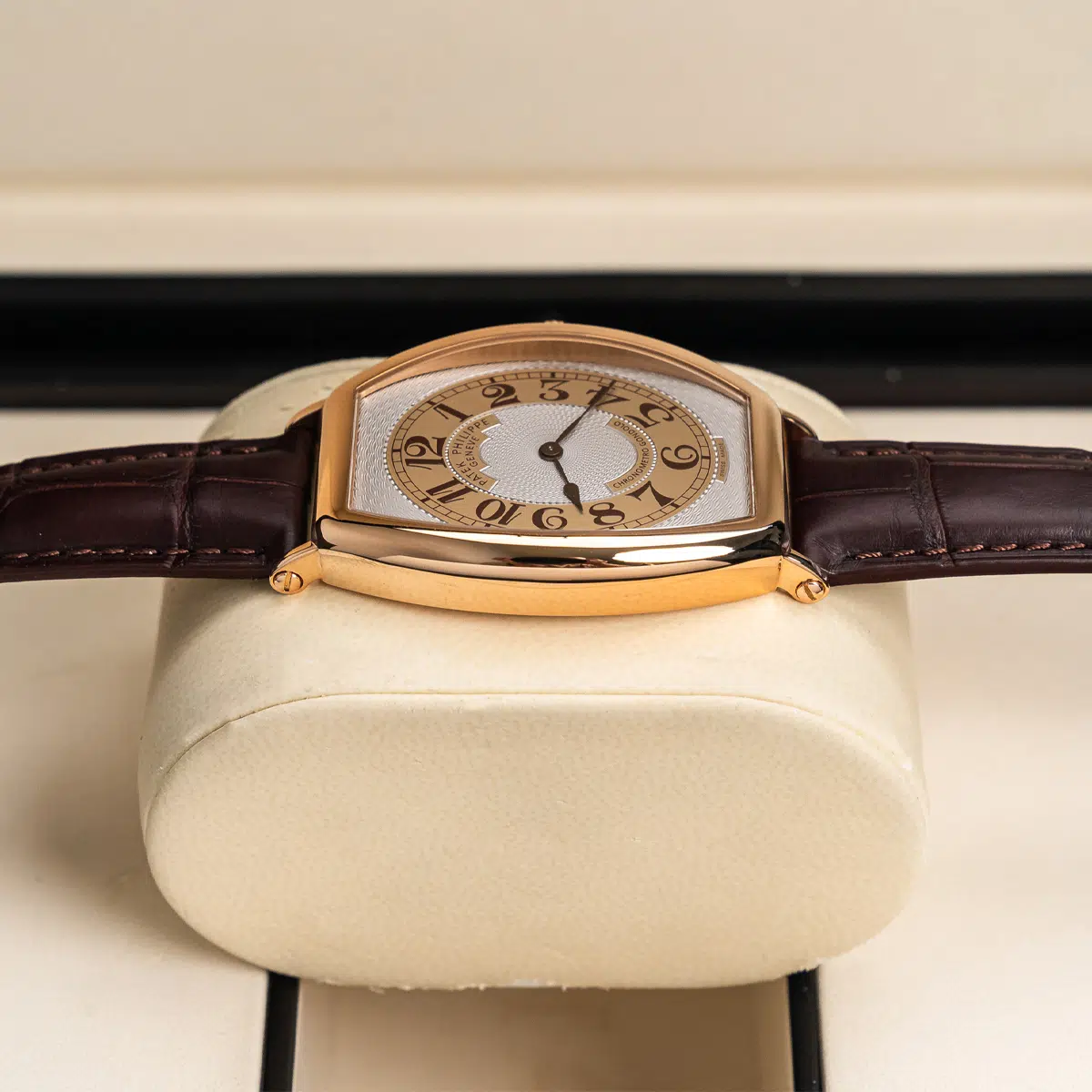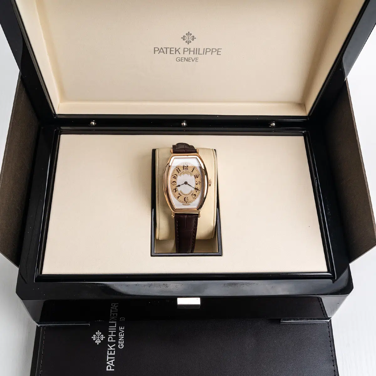 The Patek Philippe Gondolo (ref. 5098R-001) features an mechanical movement; silver dial; sapphire-crystal, transparent case back; and 42×32 mm, 18k rose gold case on a leather strap with a 18k rose gold folding clasp.