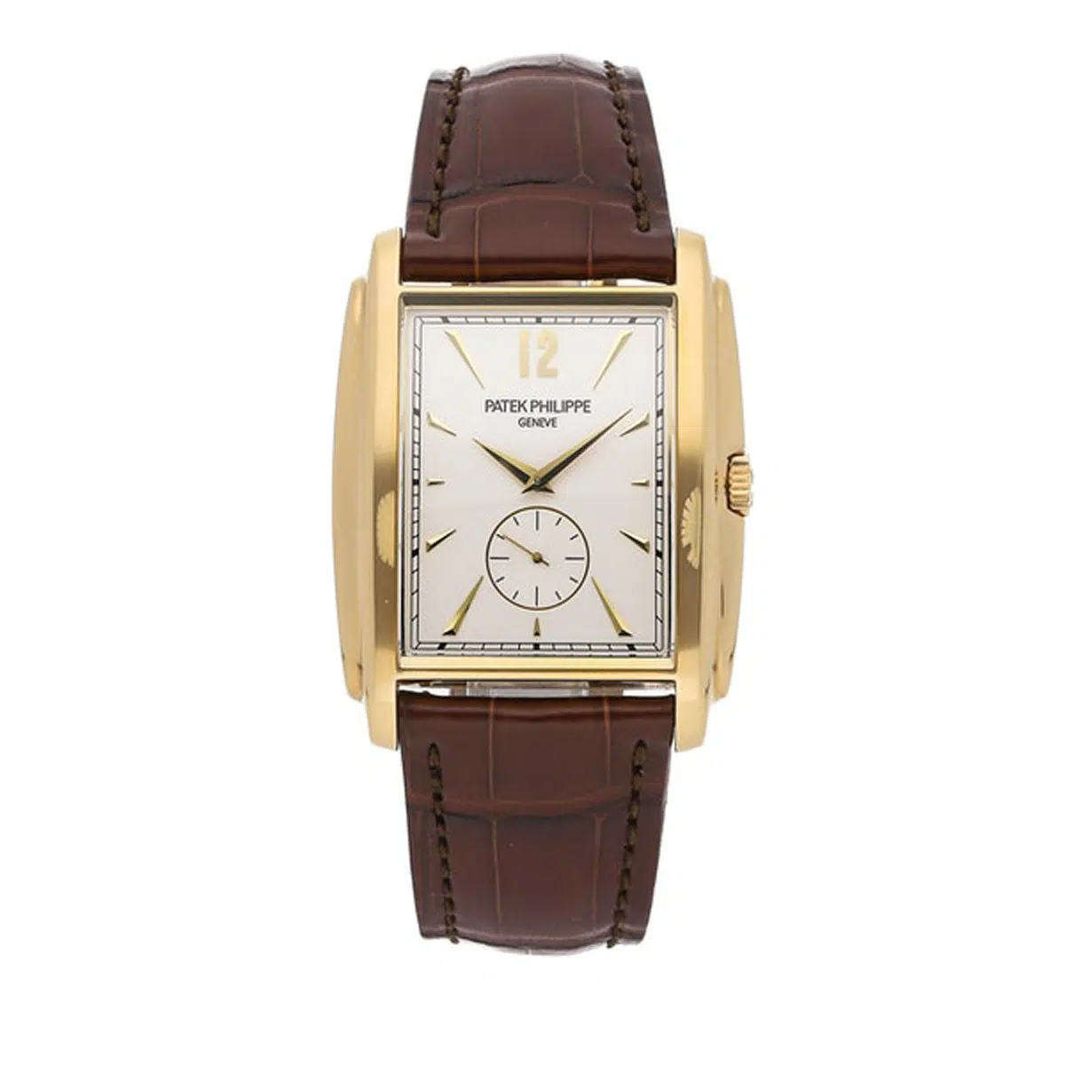 The Patek Philippe Gondolo (ref. 5124J-001) features an mechanical movement; silver dial; sapphire-crystal, transparent case back; and 43×33 mm, 18k yellow gold case on a leather strap with a 18k yellow gold folding clasp.