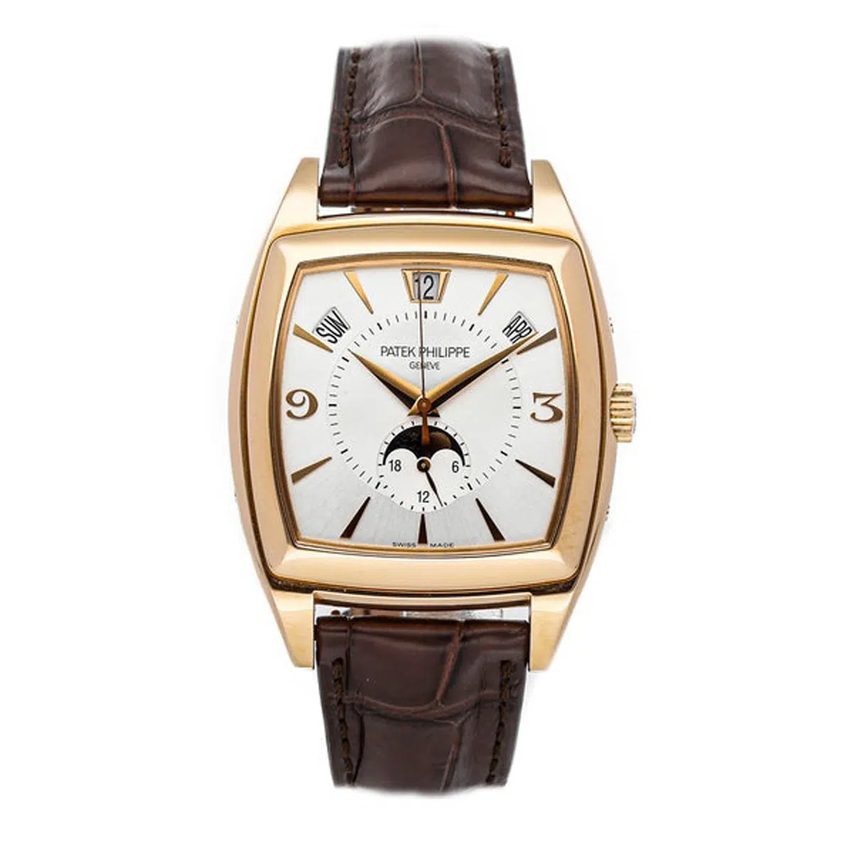 The Patek Philippe Gondolo (ref. 5135R-001) features an automatic movement; grey dial; sapphire-crystal, transparent case back; and 51×38 mm, 18k rose gold case on a leather strap with a 18k rose gold folding clasp.