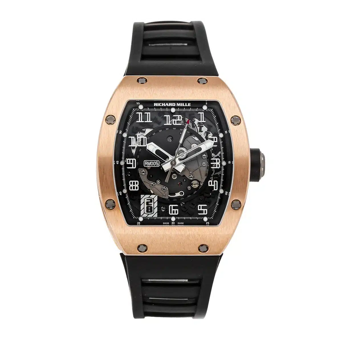 Richard Mille RM 005 (RM005AFPG) self-winding automatic watch, features a 37.8mm 18k rose gold case surrounding a skeleton dial on a black rubber strap with an 18k rose gold tang buckle.