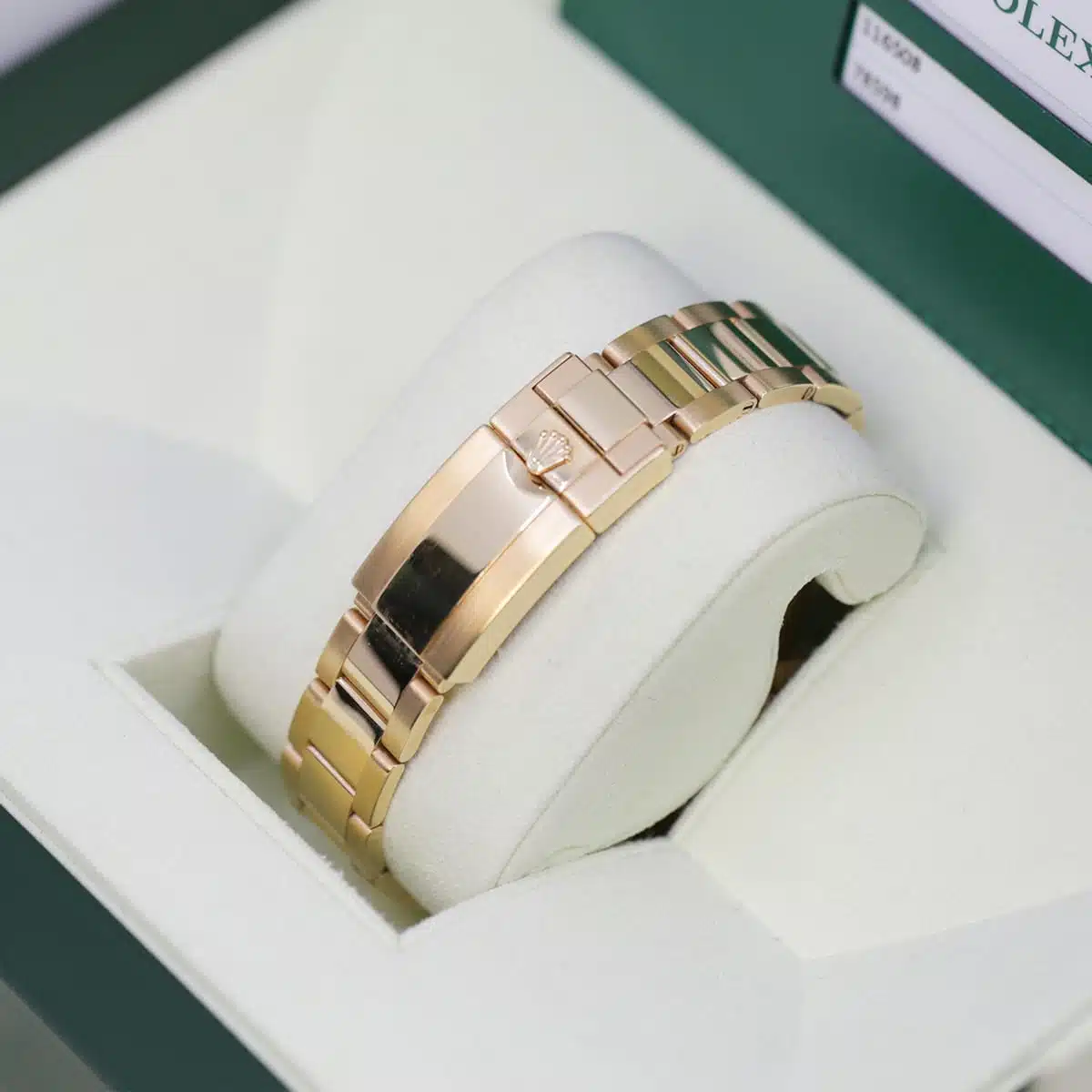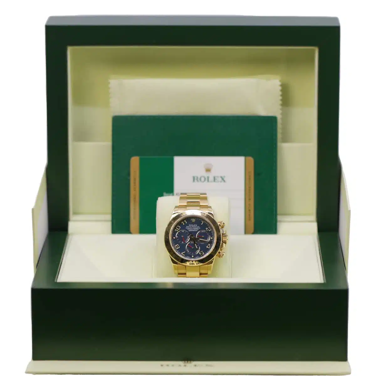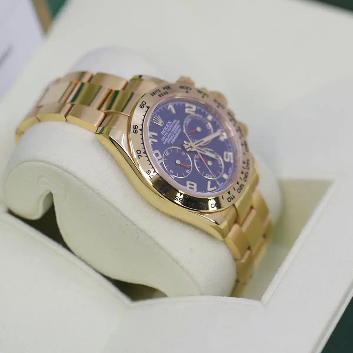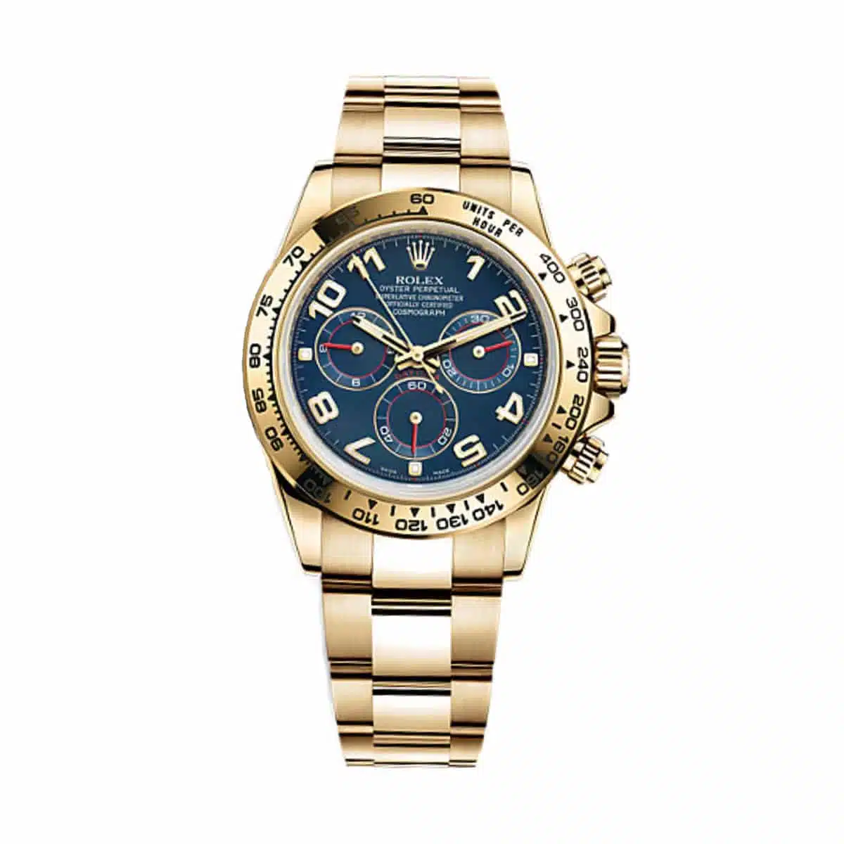 40mm 18K yellow gold case, screw-down back, screw-down crown and push buttons with Triplock triple waterproofness, fixed 18K yellow gold bezel with engraved tachymetric scale, scratch-resistant sapphire crystal, blue dial, Arabic numerals, Rolex calibre 4130 self-winding movement with chronograph central second hand, 30-minute counter at 3 o’clock, and 12-hour counter at 9 o’clock, approximately 72 hours of power reserve, 18K yellow gold Oyster bracelet with flat three-piece links, folding Oysterlock buckle with Easylink 5mm comfort extension link. Waterproof to 100 meters.
