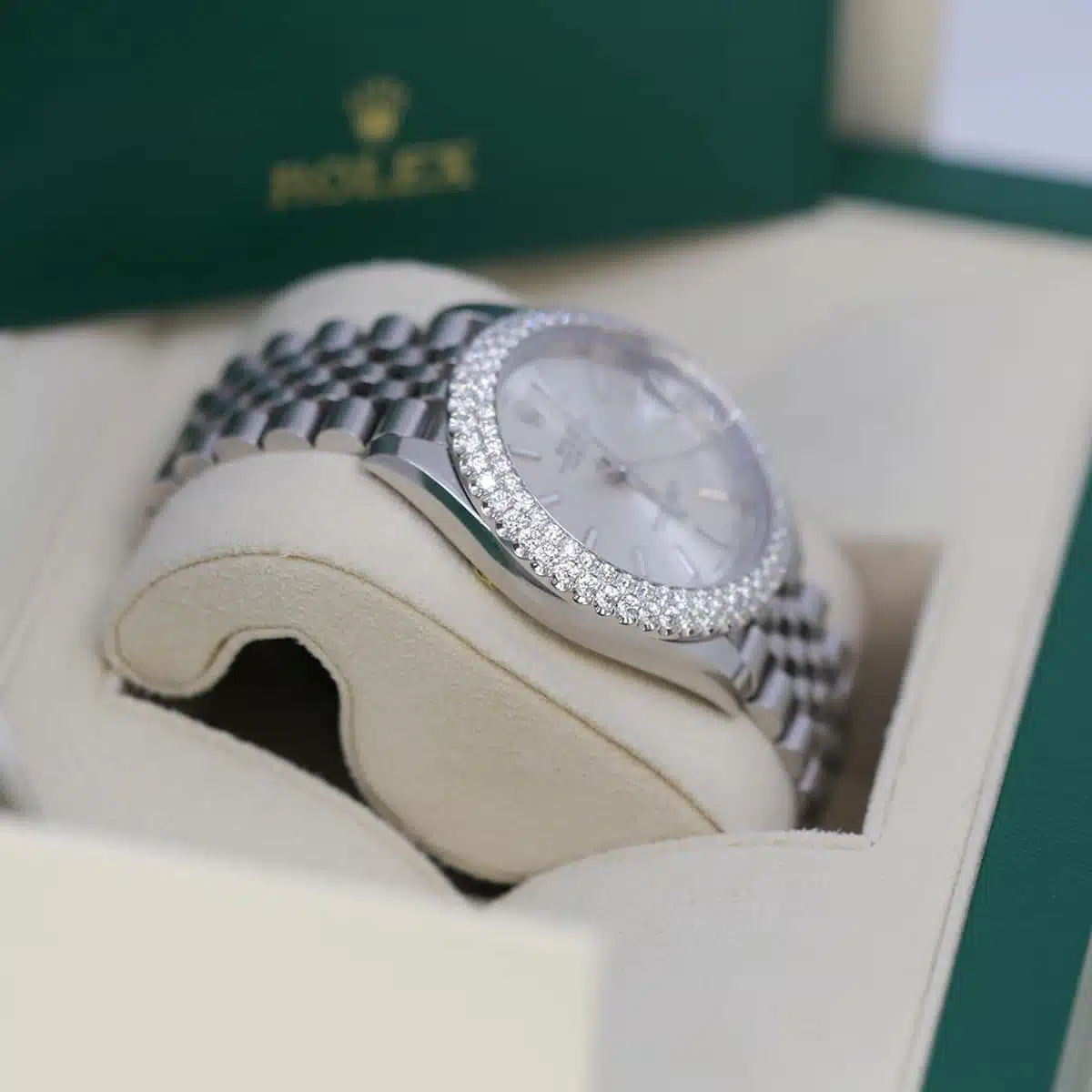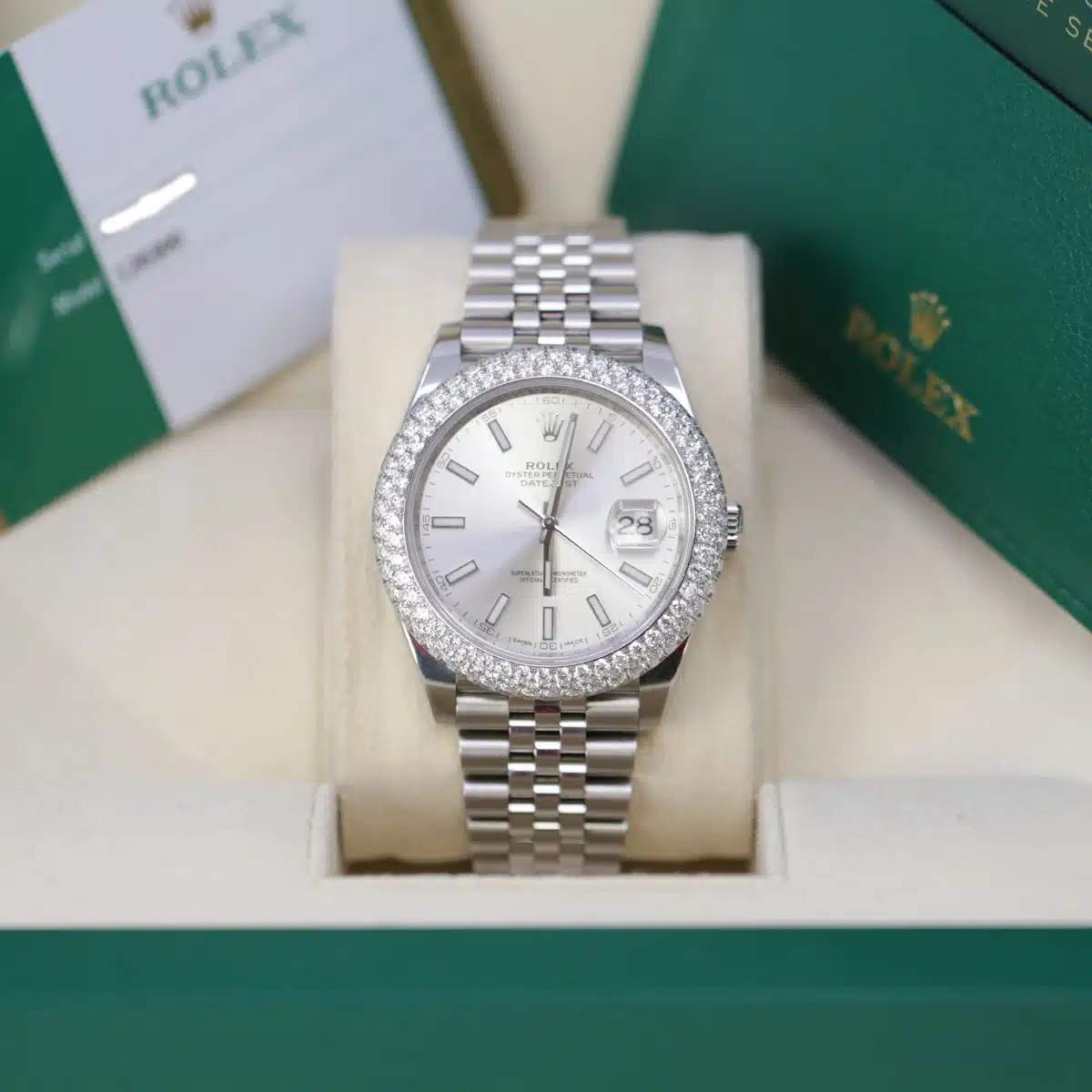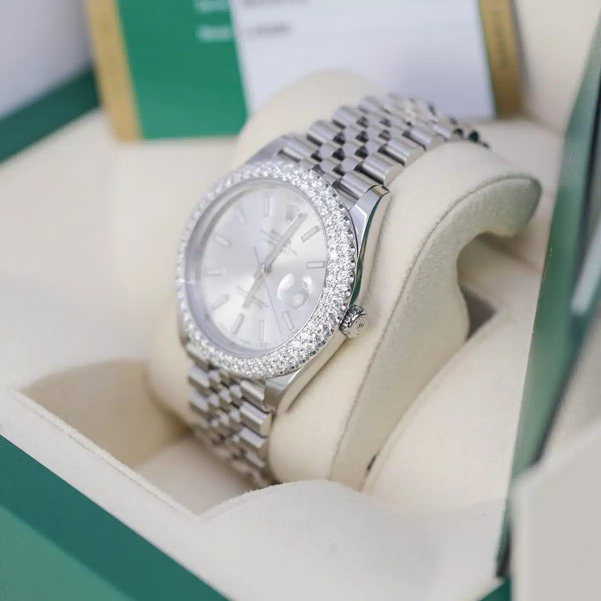 Rolex 126300 Silver Stick 41mm Dial Aftermarket Diamond Bezel