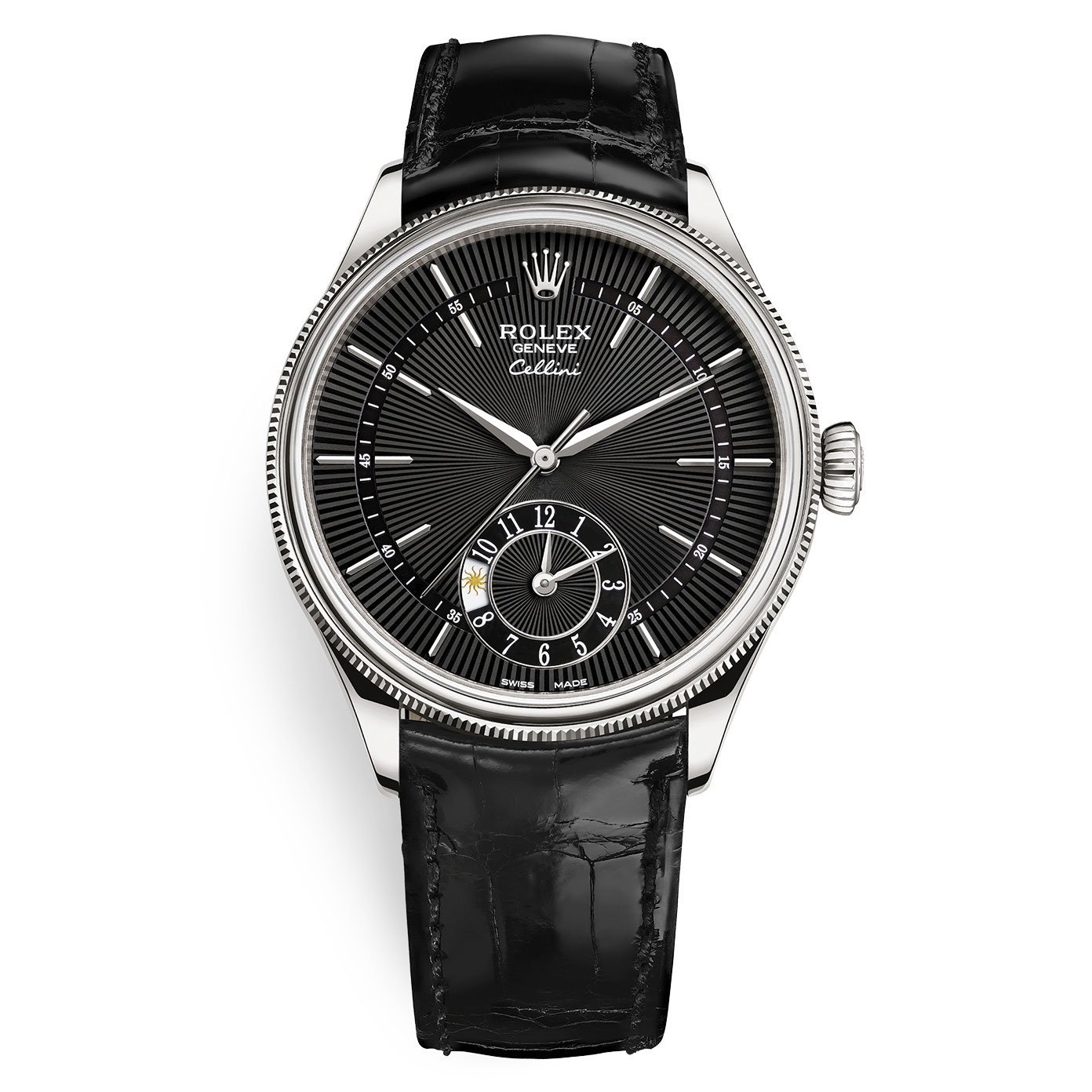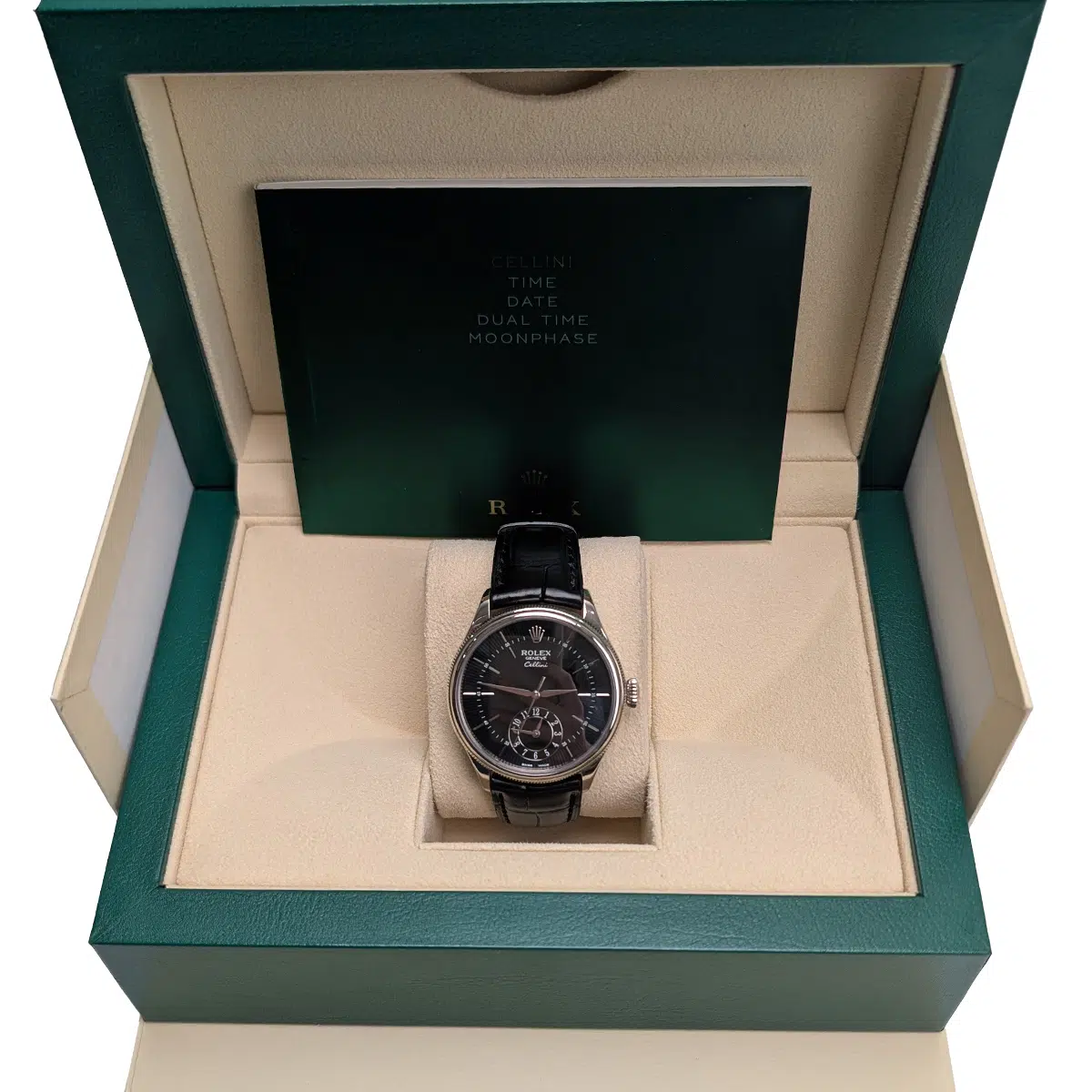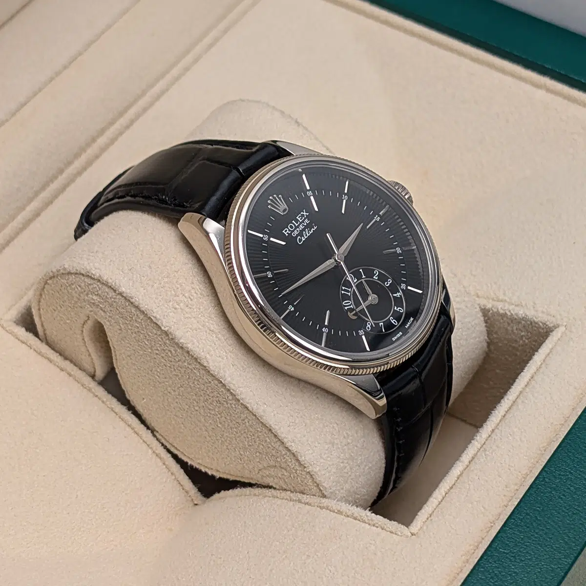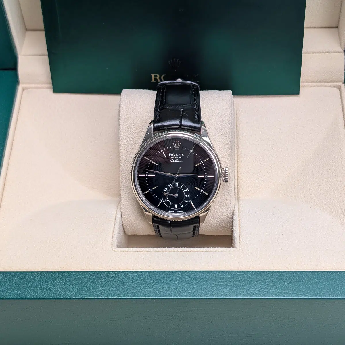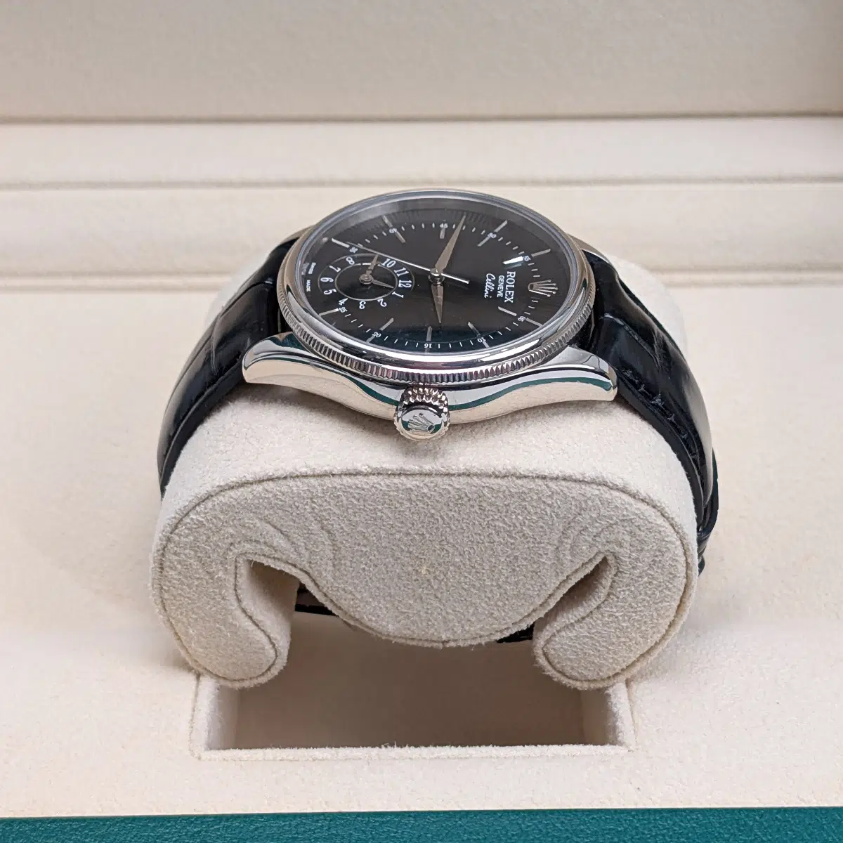 Rolex Cellini 50529 Black Dial Leather Strap Dual Time 39mm Watch