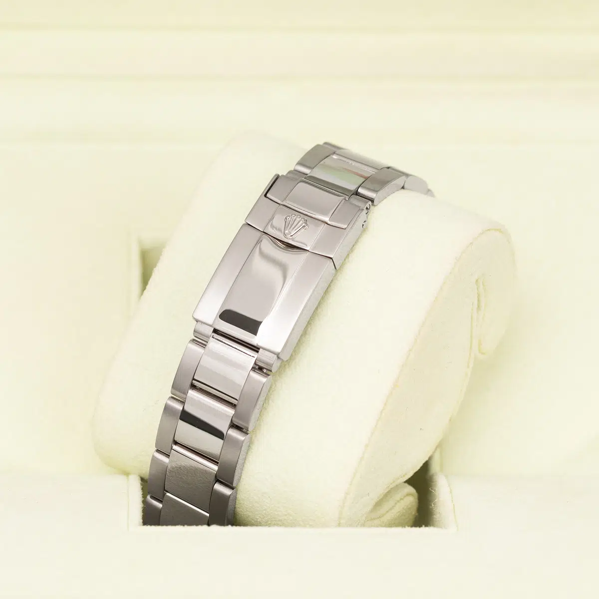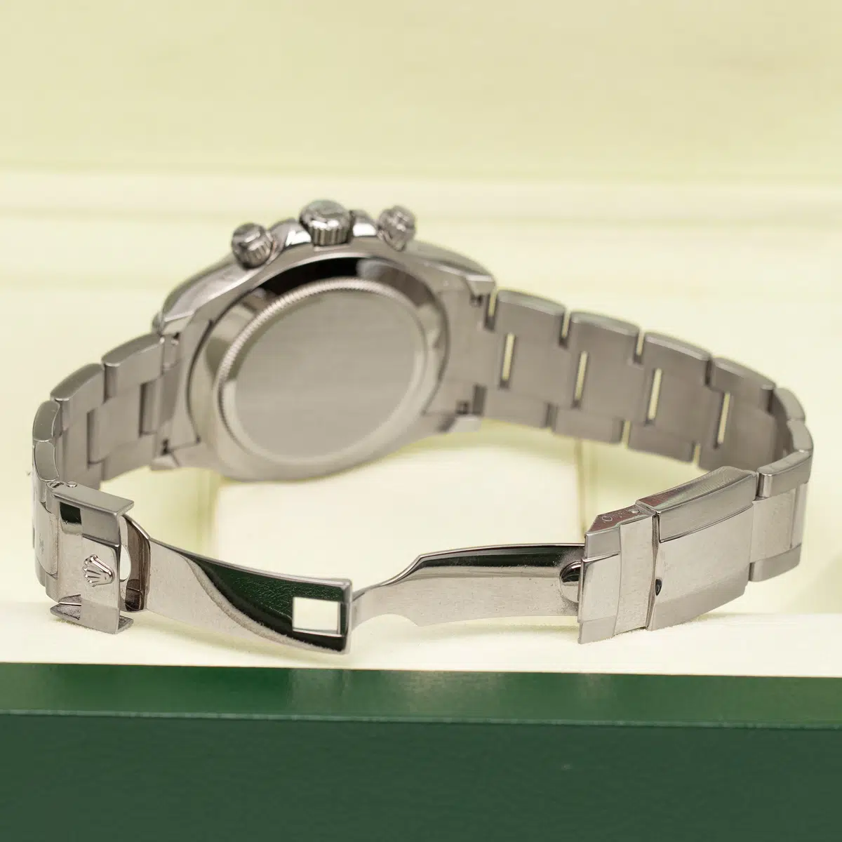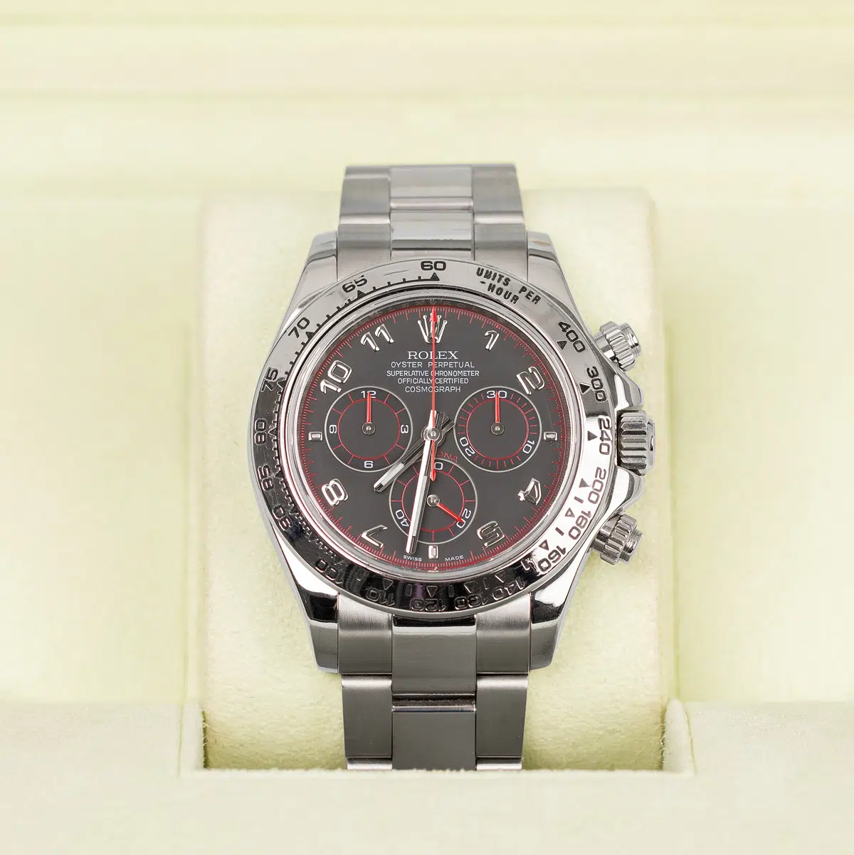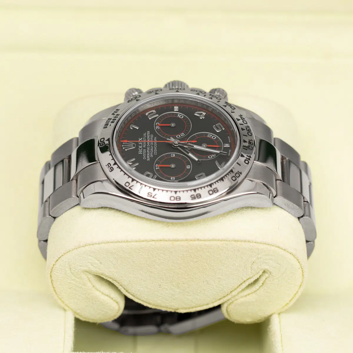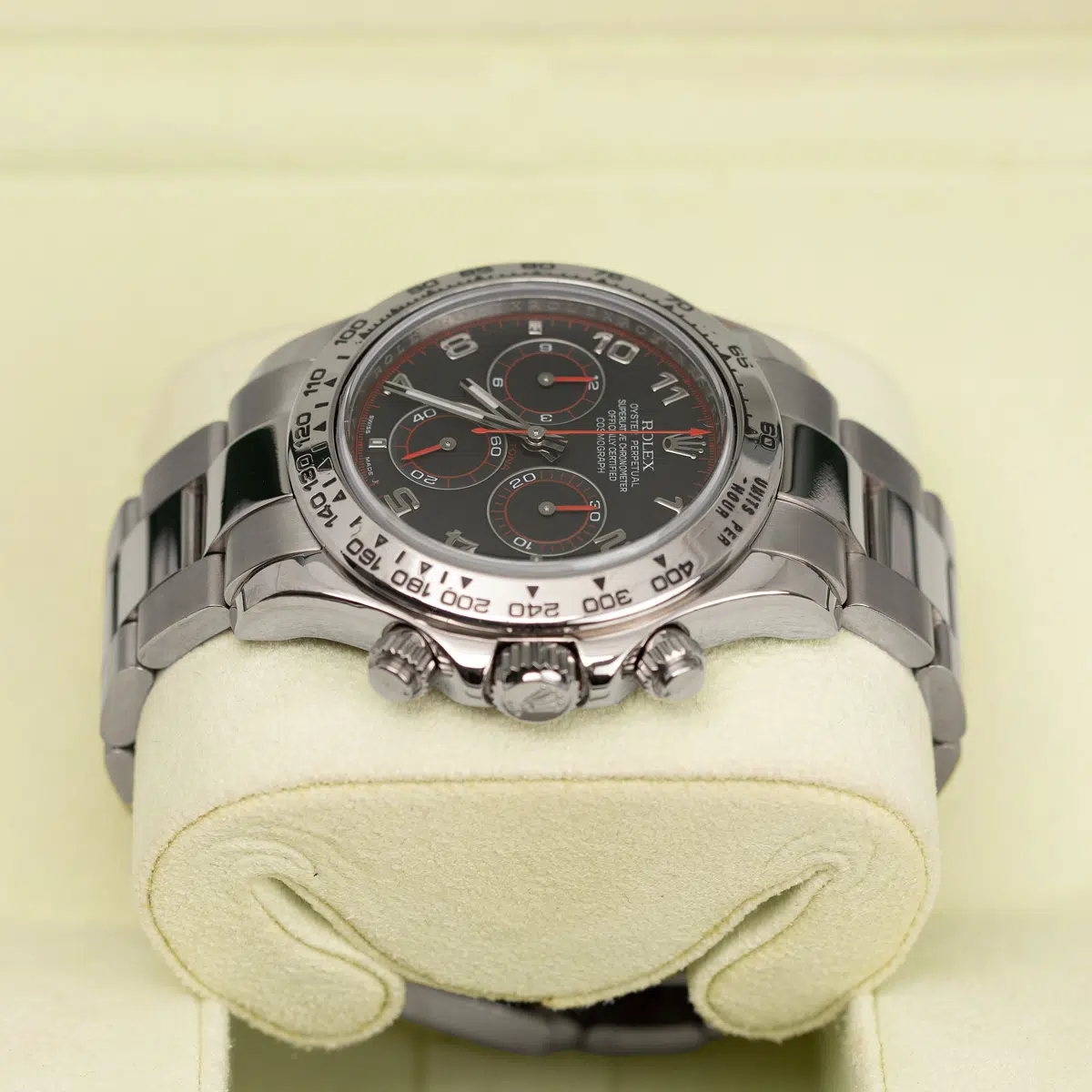 40mm 18K white gold case, tachymeter engraved bezel, screw-down push buttons, black dial, and special Oysterlock bracelet.