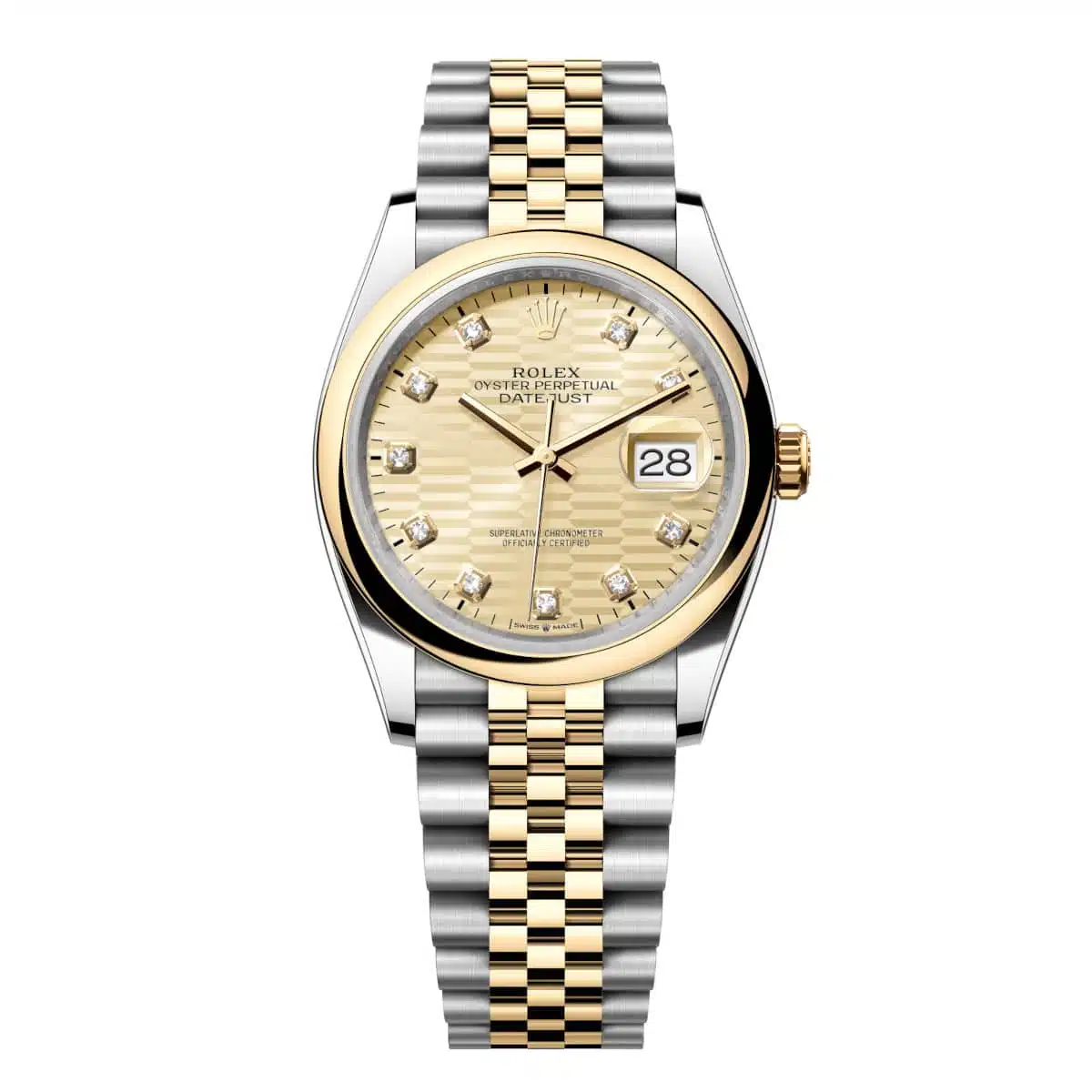 Rolex Datejust 126203-0045 Golden Fluted Motif Set with Diamonds Dial 36mm Yellow Gold & Oystersteel Domed Bezel Jubilee Bracelet
