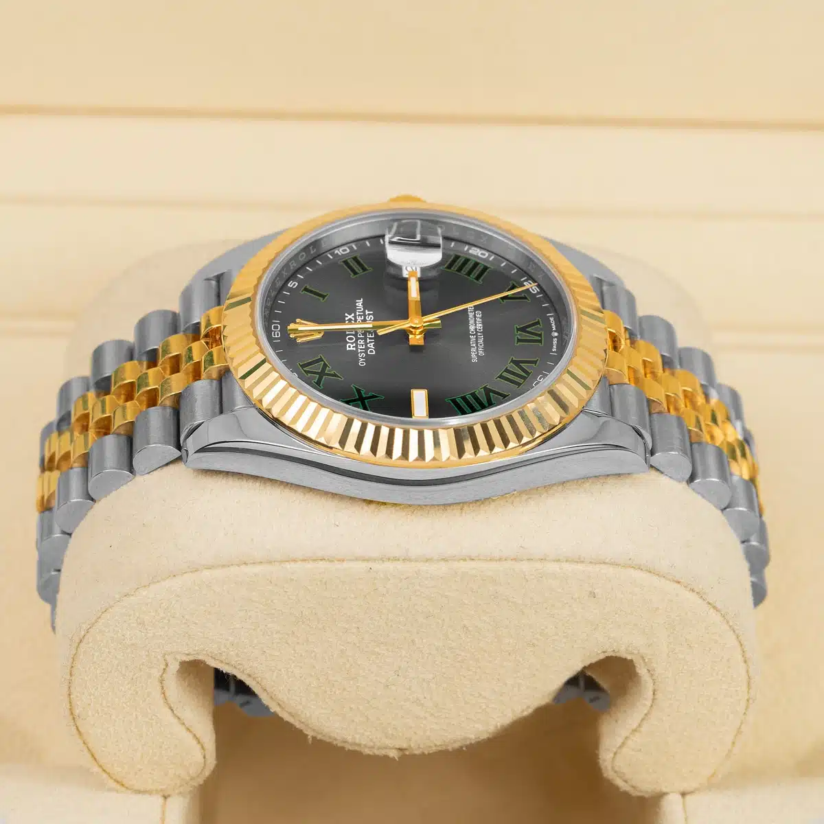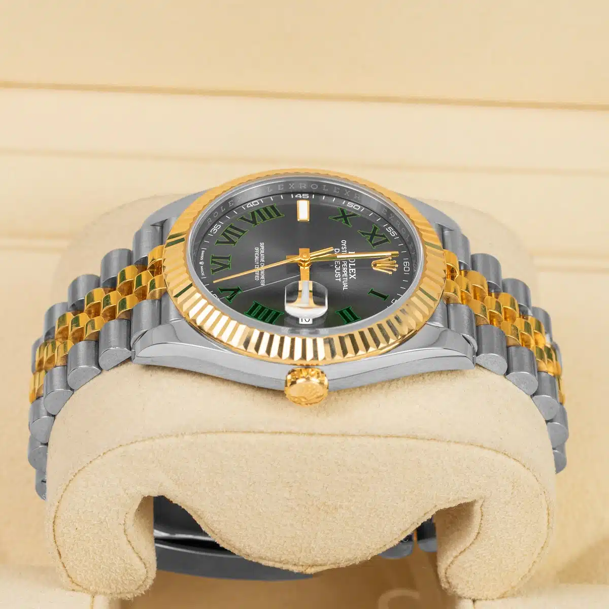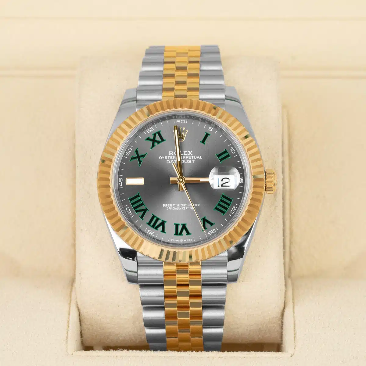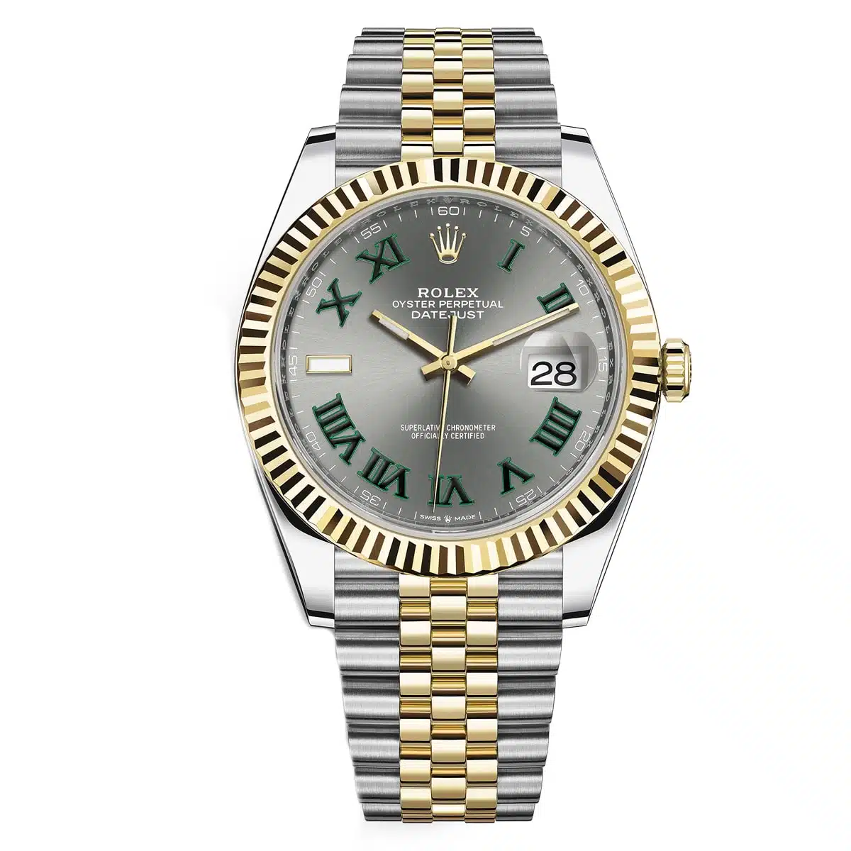 41mm Yellow Rolesor case with 904L steel monobloc middle case, screw-down steel back, 18K yellow gold screw-down crown, 18K yellow gold fluted bezel, scratch-resistant double anti-reflective sapphire crystal with cyclops lens over the date, slate dial, green Roman numerals.