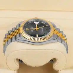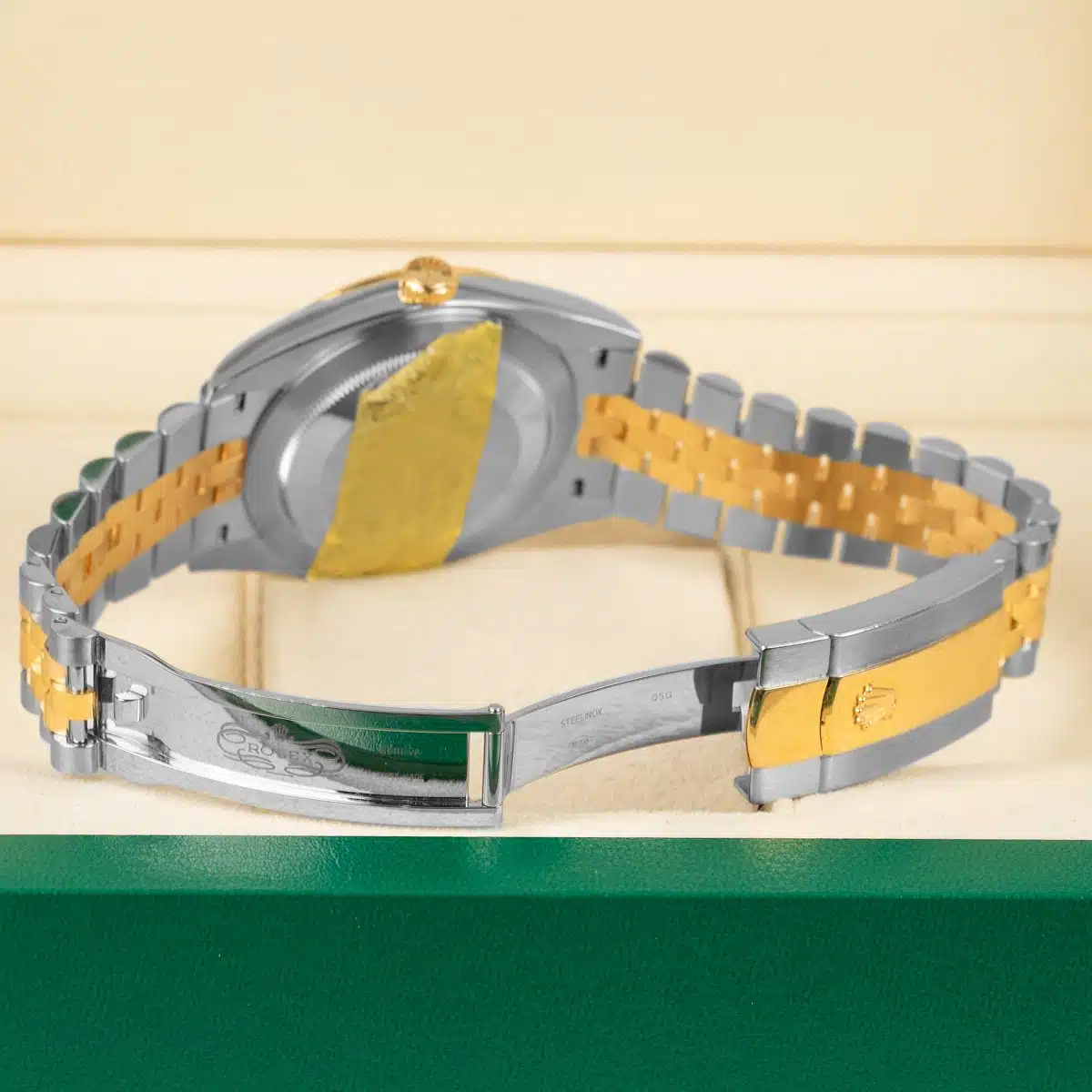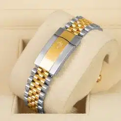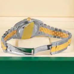Rolex calibre 3235 perpetual self-winding movement with date at 3 o’clock that changes instantaneously at midnight in a few thousandths of a second, approximately 70 hours of power reserve, yellow Rolesor Jubilee bracelet made from a combination of 904L steel and 18K yellow gold with five-piece links, folding Oysterclasp buckle with Easylink 5mm comfort extension link. Waterproof to 100 meters.