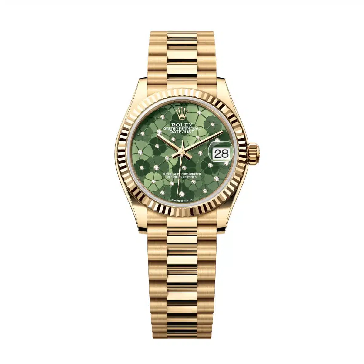 Rolex Datejust 278278-0046 Olive Green Floral Motif Roman Numeral Set with Diamonds 31mm Dial Fluted Bezel President Bracelet Yellow Gold Watch