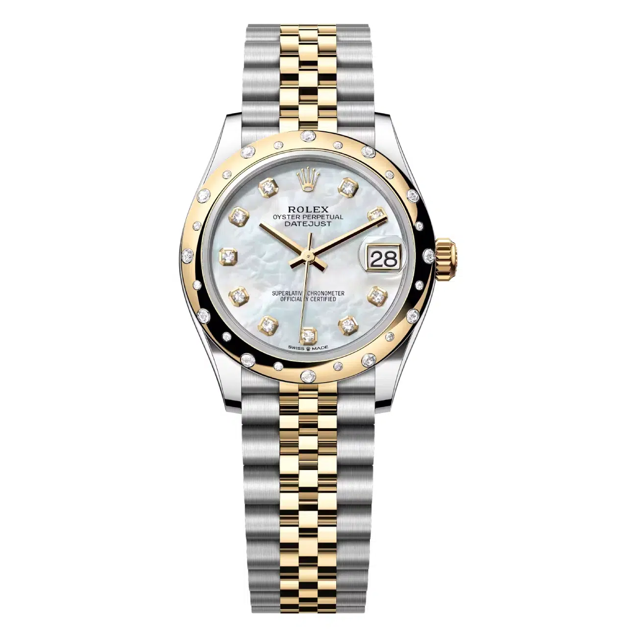 The Rolex Datejust 31 reference 278343RBR embodies timeless elegance with its 31mm yellow Rolesor case, masterfully combining Oystersteel and 18K yellow gold. This exquisite timepiece features a diamond-set bezel that frames a luminous mother-of-pearl dial adorned with diamond hour markers. Powered by the advanced Rolex calibre 2236 perpetual self-winding movement, it offers exceptional precision and approximately 55 hours of power reserve. The iconic yellow Rolesor Jubilee bracelet with concealed folding Crownclasp ensures both comfort and security. Complete with original box and papers, this 2024 model maintains Rolex’s legendary 100-meter waterproof rating through its screw-down crown and Twinlock system, representing the pinnacle of Swiss watchmaking heritage.