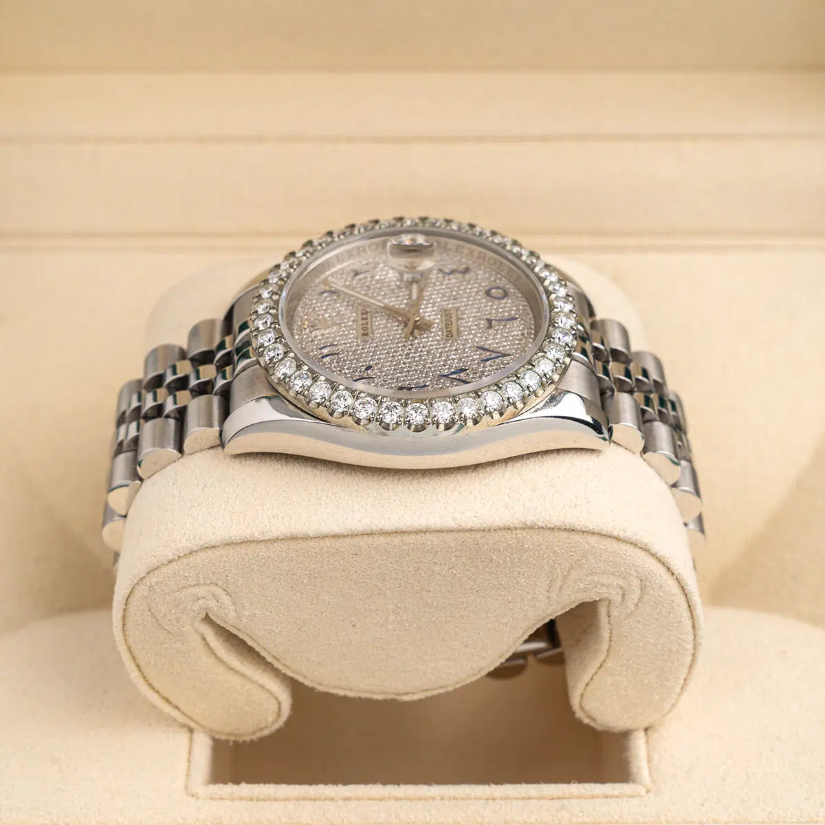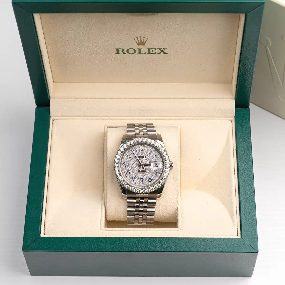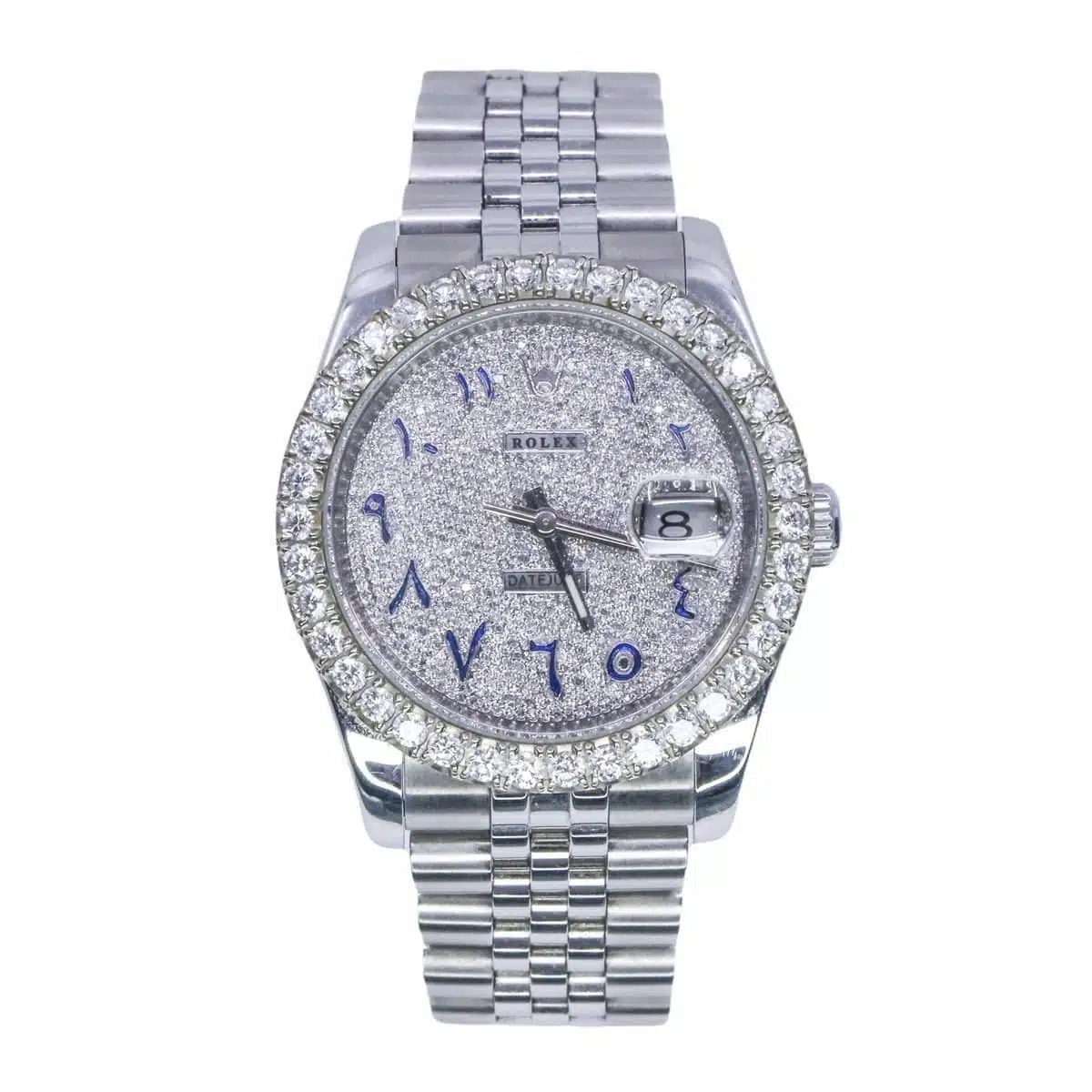 Aftermarket Diamond bezel. Aftermarket Diamond dial. Date window at 3 o’clock aperture. Stainless steel jubilee bracelet with a hidden clasp. Fits 7 3/4″ wrist.