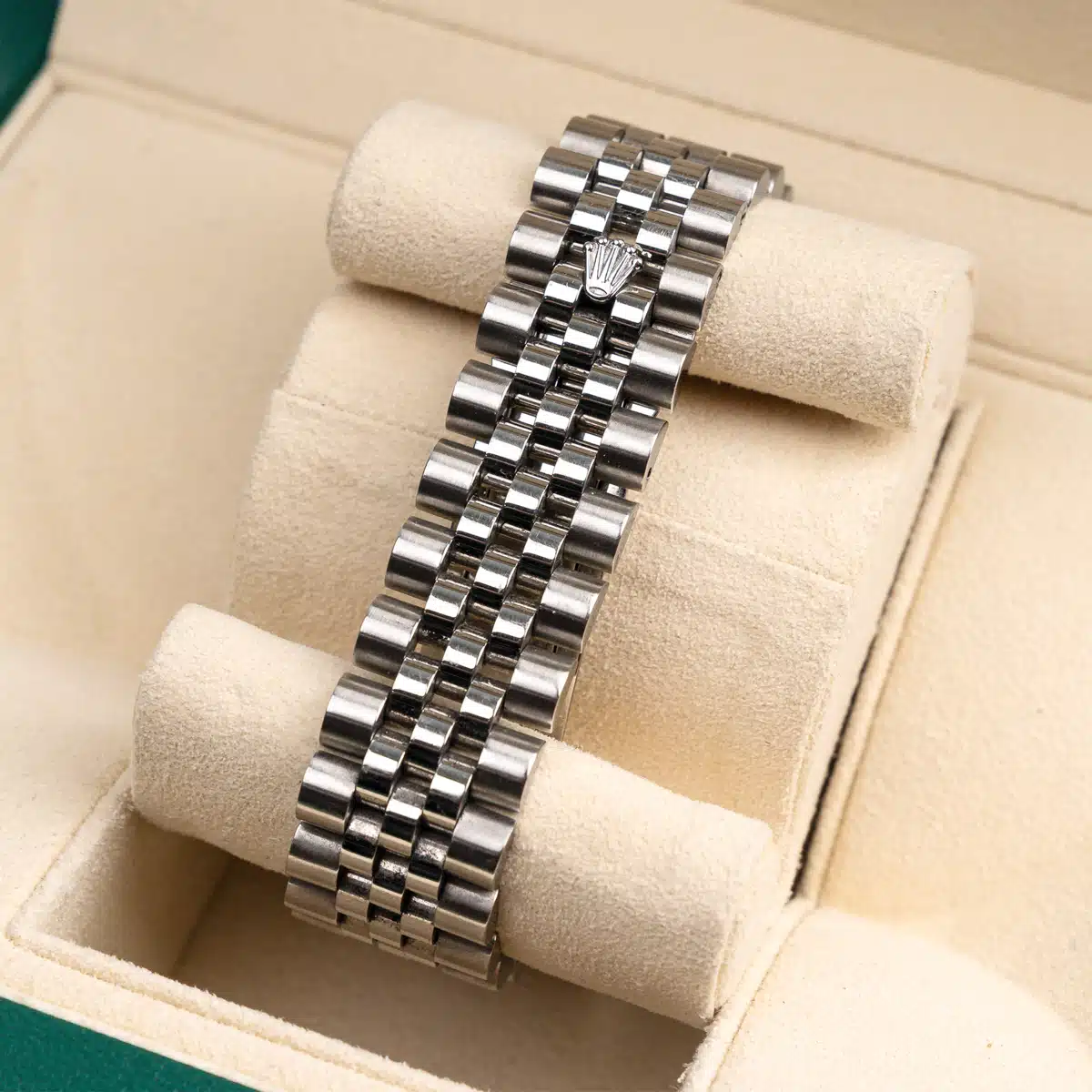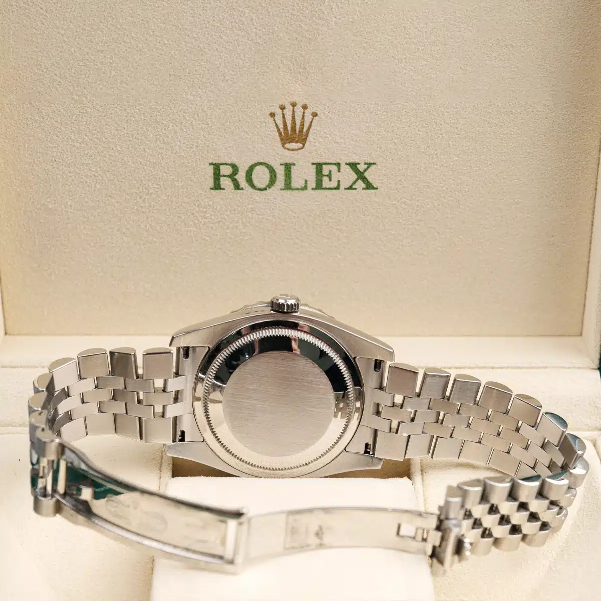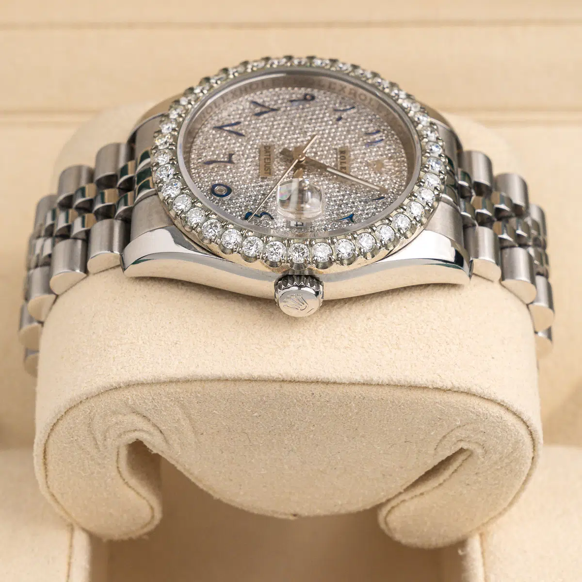 Aftermarket Diamond bezel. Aftermarket Diamond dial. Date window at 3 o’clock aperture. Stainless steel jubilee bracelet with a hidden clasp. Fits 7 3/4″ wrist.