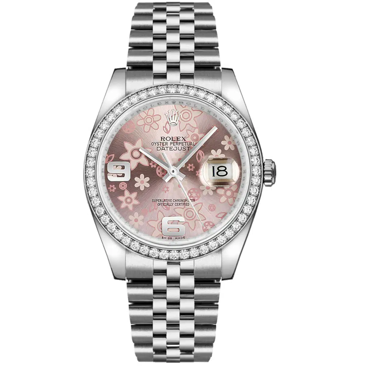 Rolex Datejust 116244-0004 Pink Floral Motif Arabic Numeral 36mm Dial Diamond Set Bezel Oystersteel Jubilee Bracelet Watch