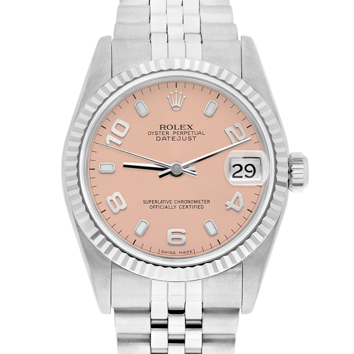 The Rolex Datejust, introduced in 1945, represents one of horology’s most enduring designs, celebrated for its perfect balance of form and function. Reference 68274 from 1997 exemplifies Rolex’s commitment to precision and heritage, featuring the brand’s signature Oyster case construction with screw-down crown for 100-meter water resistance. The salmon dial, a sophisticated choice that transitions beautifully from day to evening wear, complements the fluted white gold bezel’s refined texture. Crafted with Rolex’s meticulous attention to detail, the automatic movement ensures reliable timekeeping while the quick-set date mechanism demonstrates practical innovation. The Jubilee bracelet, originally designed for the Datejust’s debut, provides exceptional comfort and classic styling. This timepiece transitions seamlessly from professional settings to formal occasions, embodying Rolex’s philosophy of enduring quality and understated luxury that has made the Datejust a preferred choice for generations of discerning watch enthusiasts.