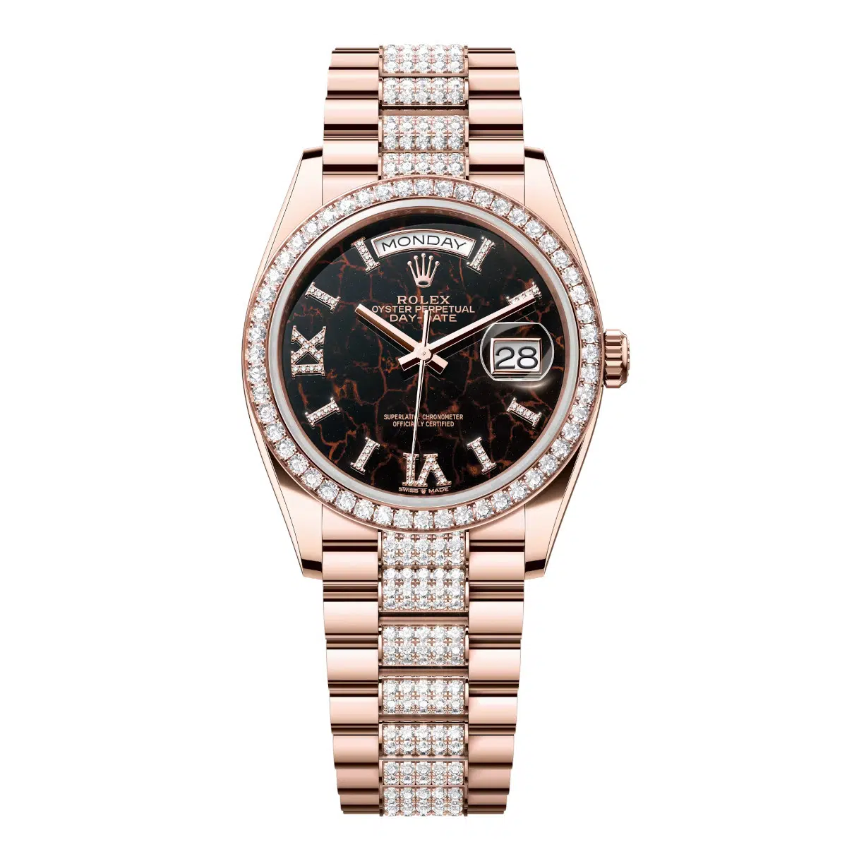 Rolex Day-Date 128345RBR-0045 Eisenkiesel Roman Numeral Set with Diamonds 36mm Dial Diamond Set Bezel Everose Gold Diamond President Bracelet Watch