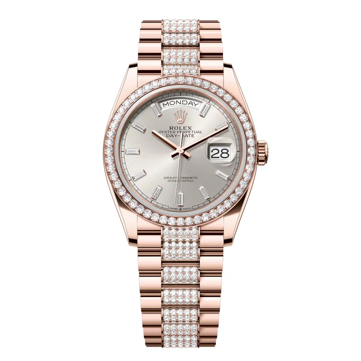 Rolex Day-Date 128345RBR-0082 Silver Set with Diamonds 36mm Dial Diamond Set Bezel Everose Gold Diamond President Bracelet Watch