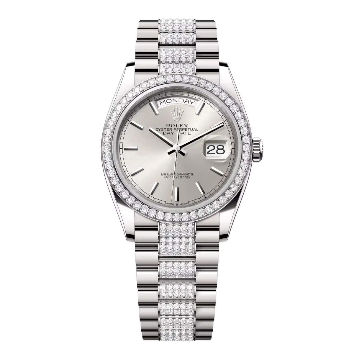 Rolex Day-Date 128349RBR-0013 Silver 36mm Dial Diamond Set Bezel White Gold Diamond President Bracelet Watch