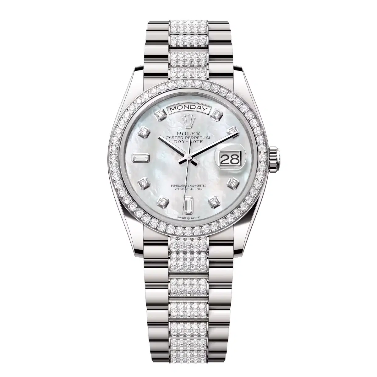 Rolex Day-Date 128349RBR-0014 White Mother-of-Pearl Set with Diamonds 36mm Dial Diamond Set Bezel White Gold Diamond President Bracelet Watch
