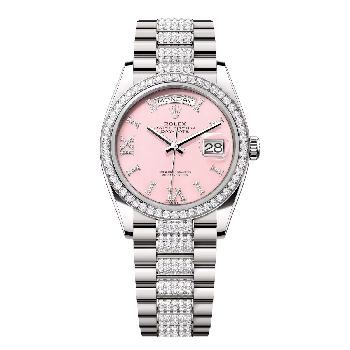 Rolex Day-Date 128349RBR-0017 Pink Opal Roman Numeral Set with Diamonds 36mm Dial Diamond Set Bezel White Gold Diamond President Bracelet Watch