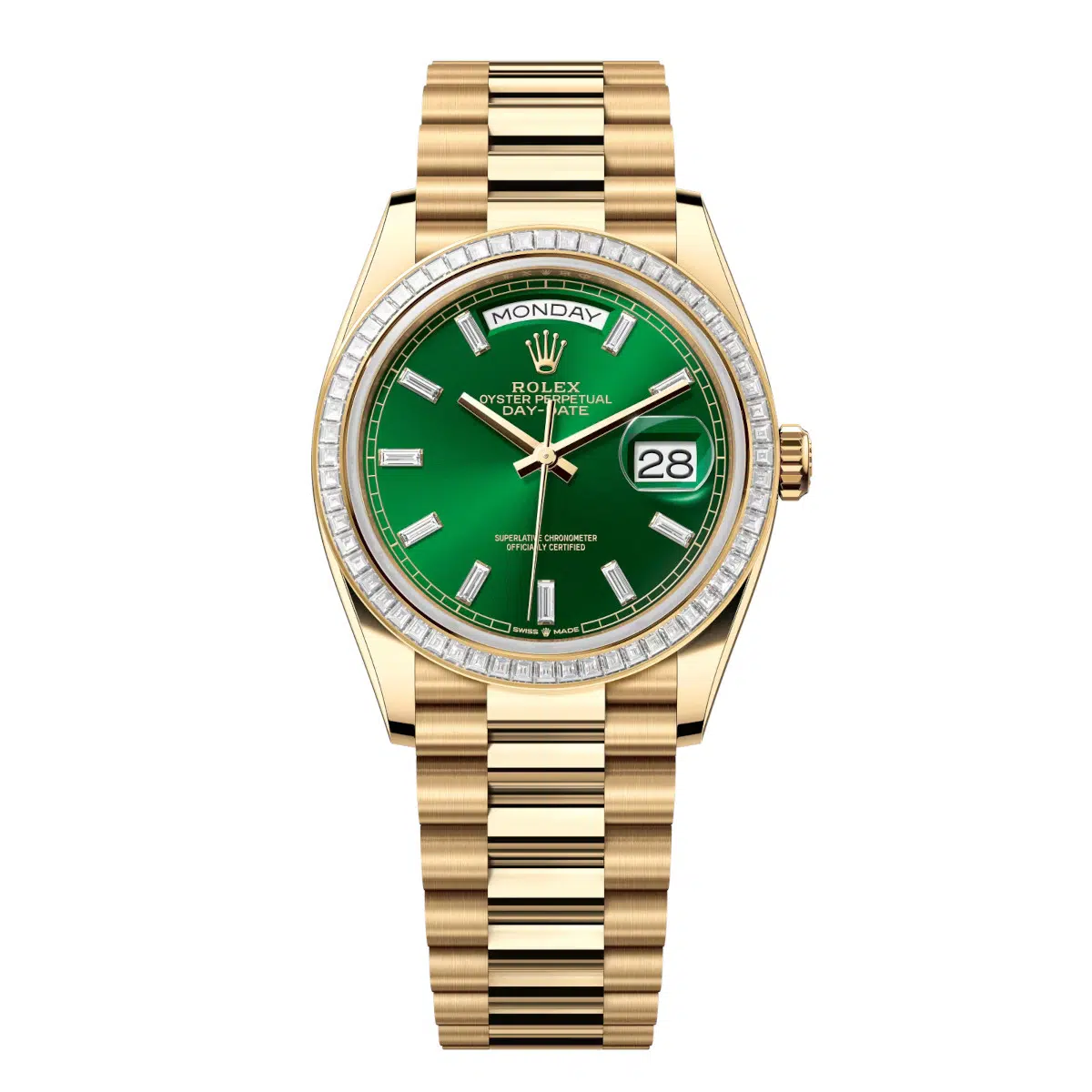 Rolex Day-Date 128398TBR-0035 Bright Green Set with Diamonds 36mm Dial Diamond Set Bezel Yellow Gold President Bracelet Watch