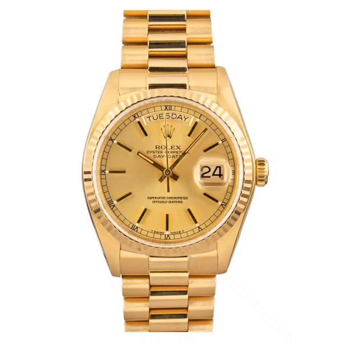 Yellow gold-tone 18kt yellow gold case with a yellow gold-tone 18kt yellow gold president bracelet. Fixed yellow gold-tone 18kt yellow gold bezel. Champagne dial with yellow gold-tone hands and Stick hour markers. Minute markers around the outer rim. Dial Type: Analog. Date display at the 3 o’clock position.