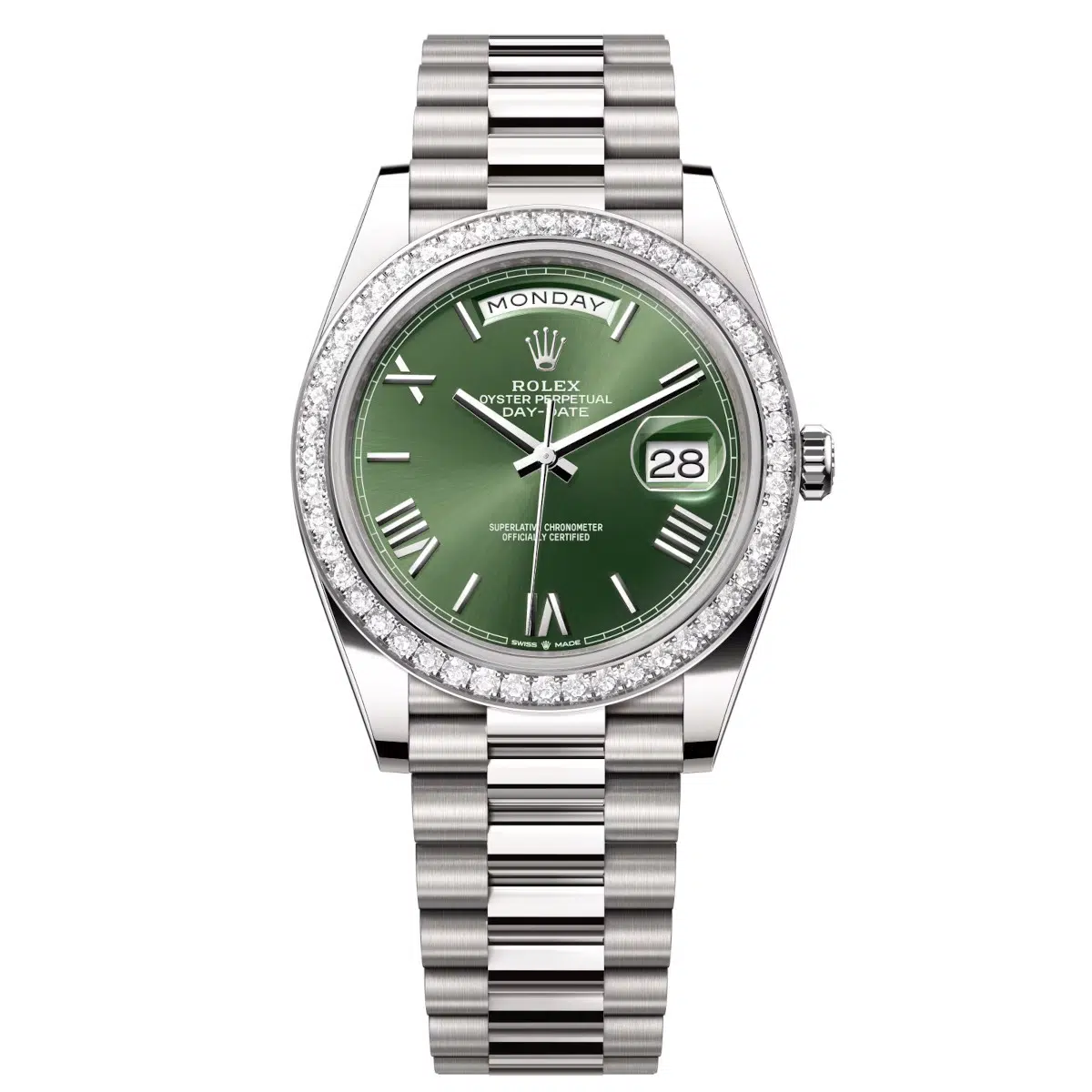 Rolex Day-Date 228349RBR-0030 Olive Green Roman Numeral 40mm Dial Diamond Set Bezel White Gold President Bracelet Watch