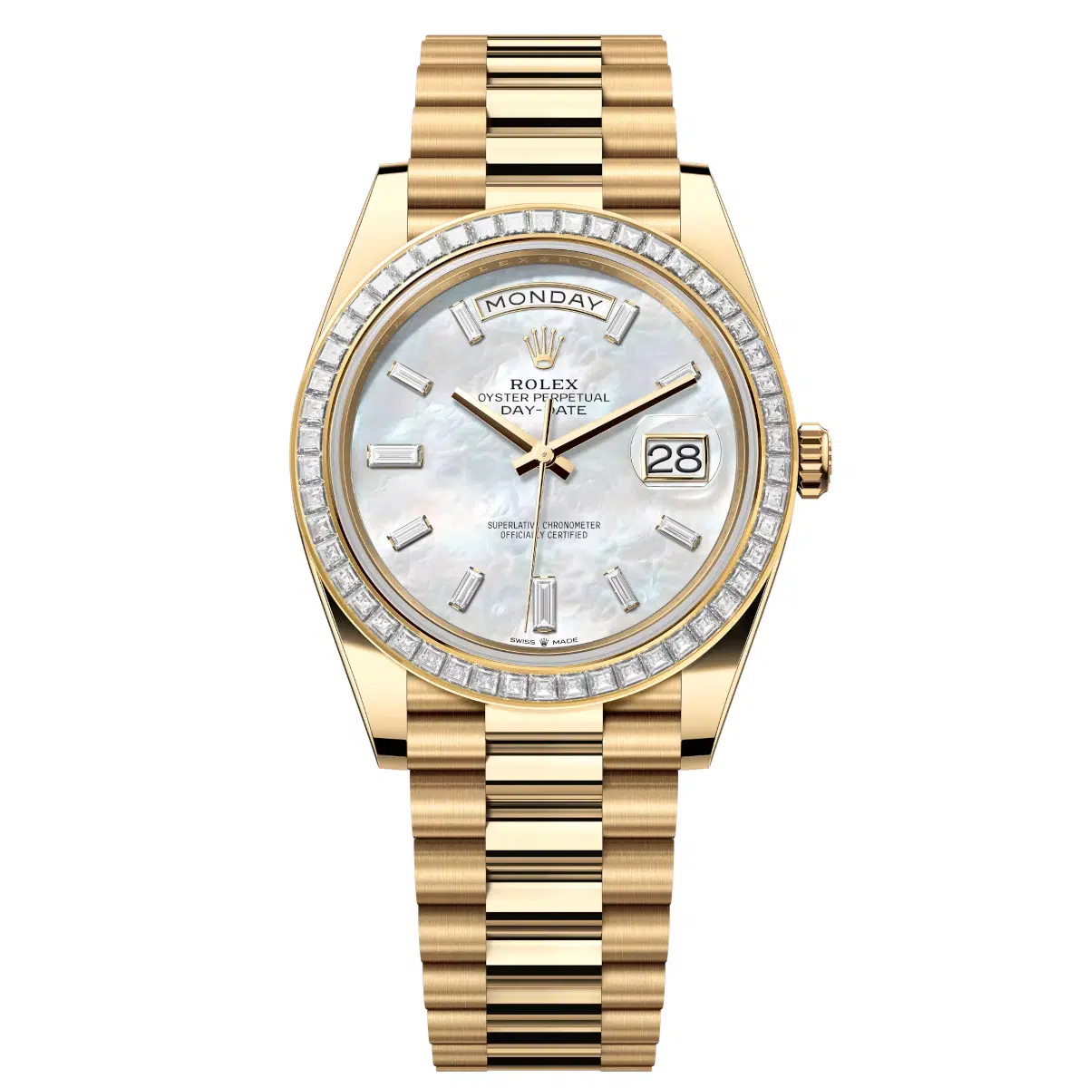 Rolex Day-Date 228398TBR-0043 White Mother-of-Pearl Set with Diamonds 40mm Dial Diamond Set Bezel Yellow Gold President Bracelet Watch