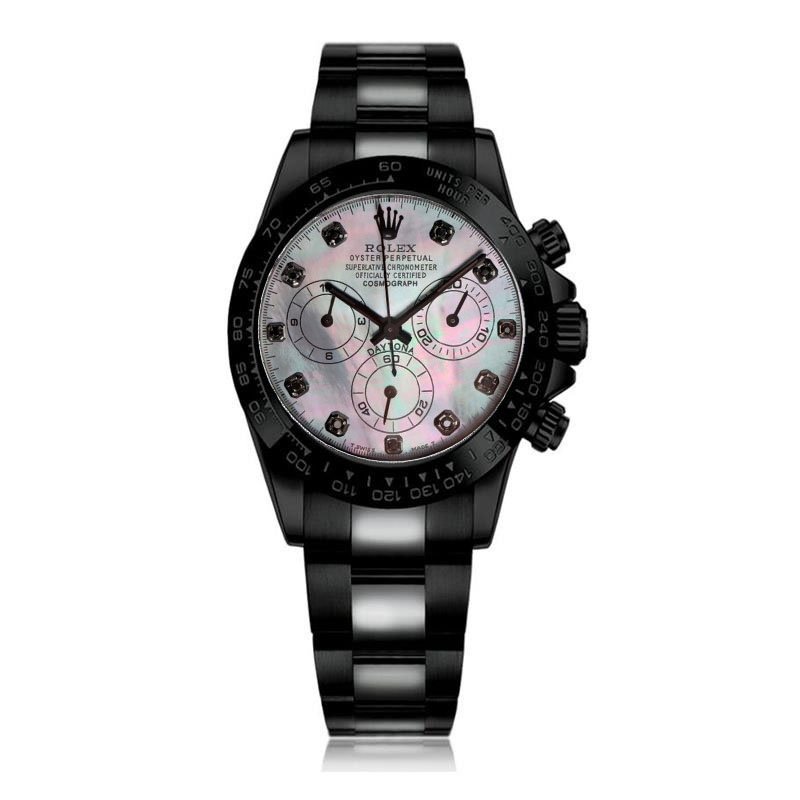 The Rolex Daytona reference 116523 represents a sophisticated evolution of the iconic chronograph that has defined motorsport timing since 1963. This particular model showcases Rolex’s mastery of materials with its black PVD/DLC coating, providing enhanced scratch resistance while maintaining the watch’s signature aesthetic. The black mother-of-pearl dial creates a mesmerizing play of light, complemented by diamond hour markers that elevate the timepiece’s luxury appeal. The automatic chronometer movement ensures precision timing to 1/8th of a second, a testament to Rolex’s commitment to horological excellence. The screw-down crown and pushers provide 100-meter water resistance, making this Daytona suitable for both formal occasions and active lifestyles. As part of Rolex’s Oyster Perpetual collection, this watch embodies the brand’s heritage of innovation and enduring design, making it an ideal choice for collectors and enthusiasts seeking a distinctive chronograph with both technical prowess and aesthetic refinement.