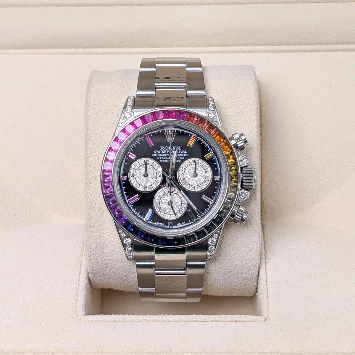 Rolex 116520 Daytona 40mm Custom Rainbow Black Dial Rainbow Bezel Stainless Oyster Watch, 2-year warranty with Luxury Watches USA and Rolex Box