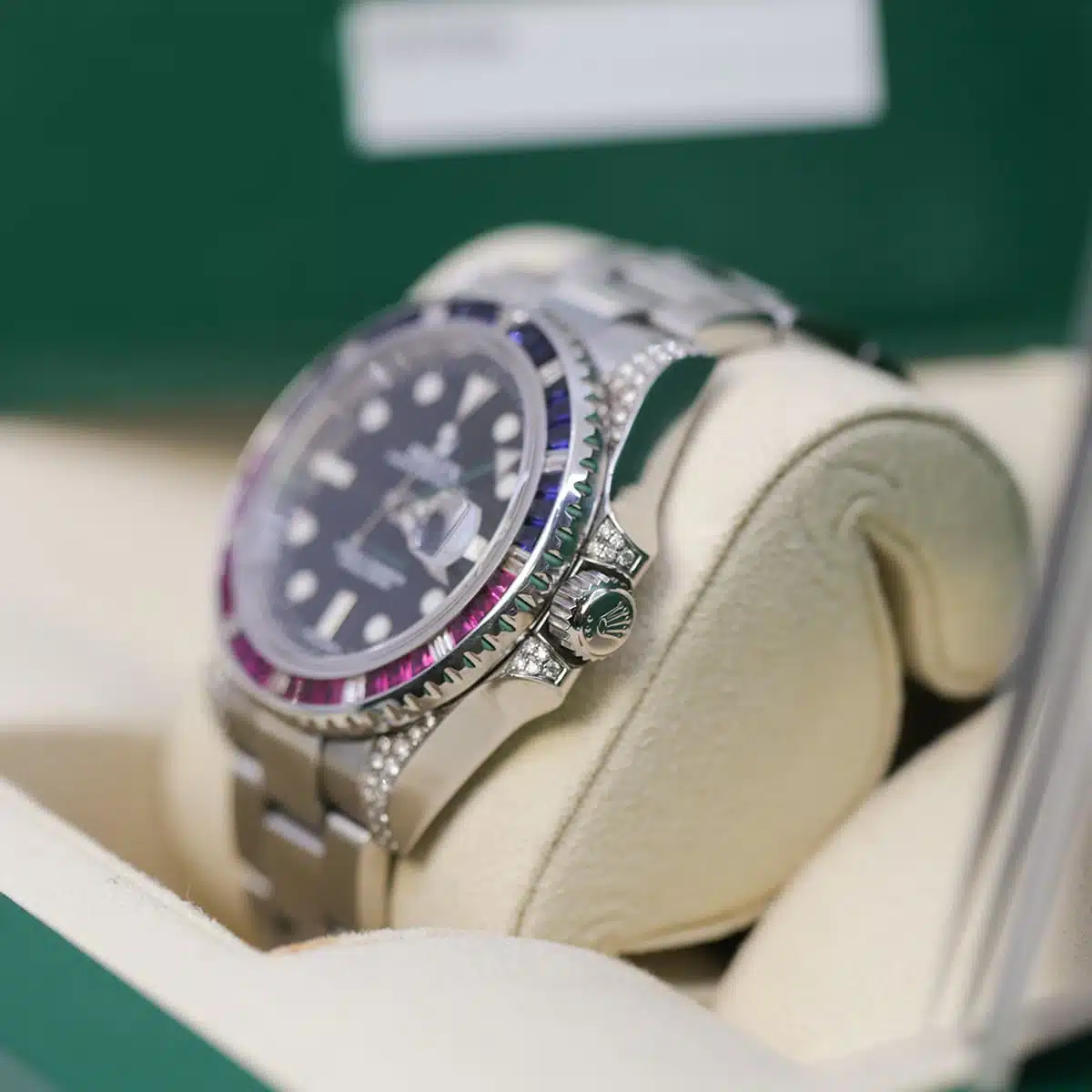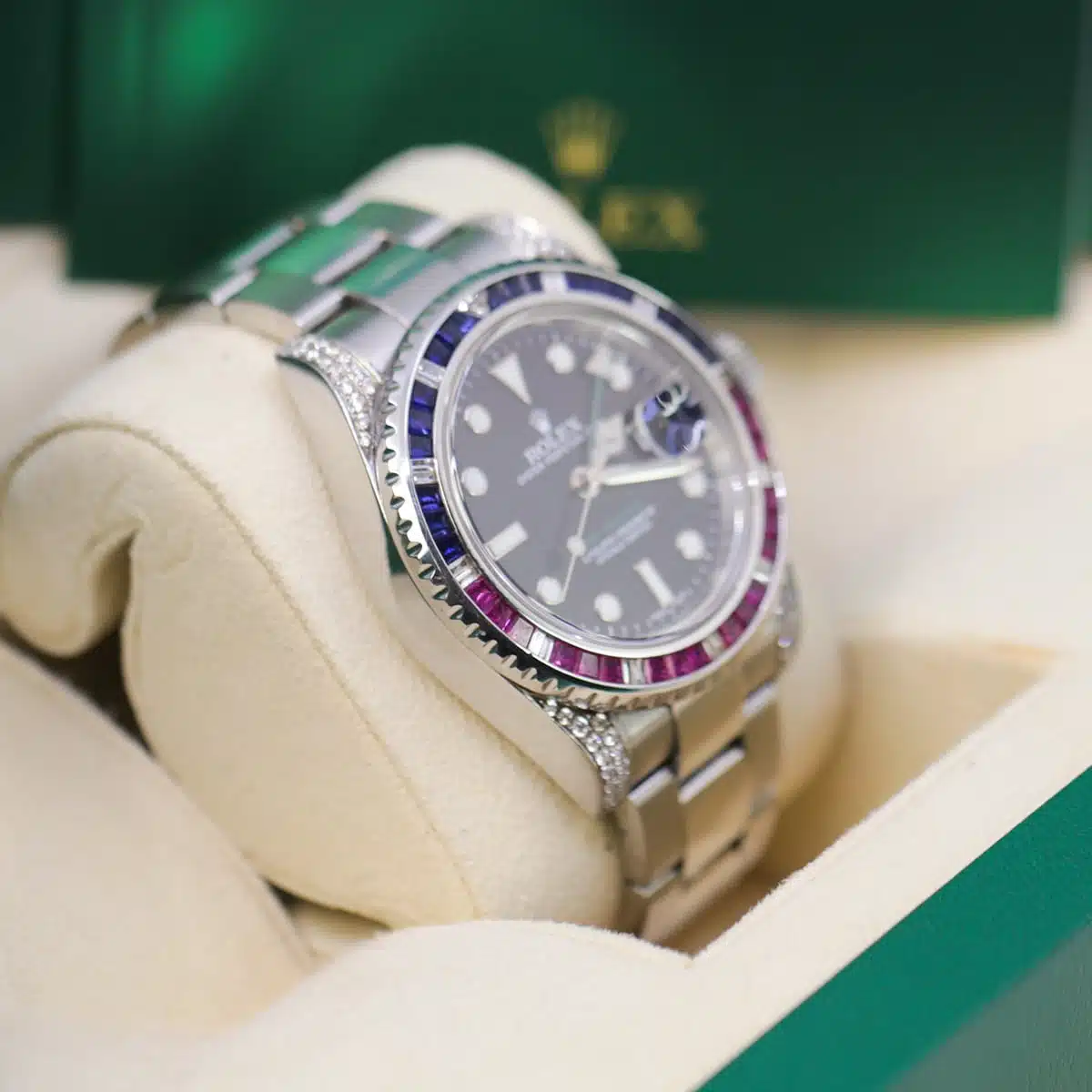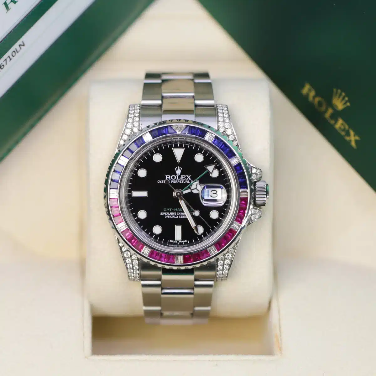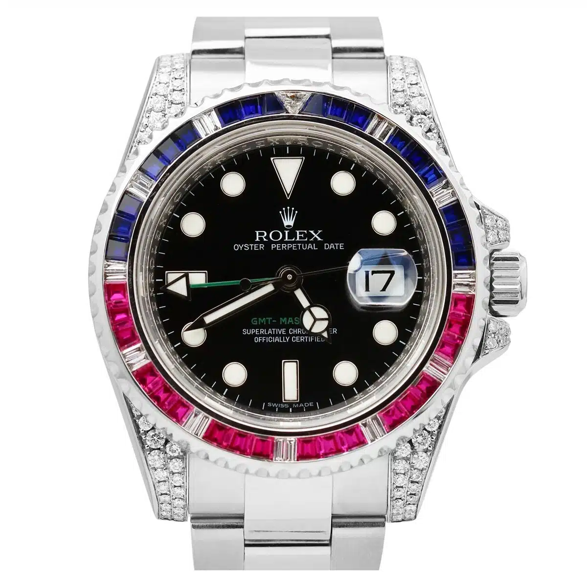 Rolex GMT-Master II 116710LN 40 mm Aftermarket Sapphire Ruby Diamond Bezel and Lugs