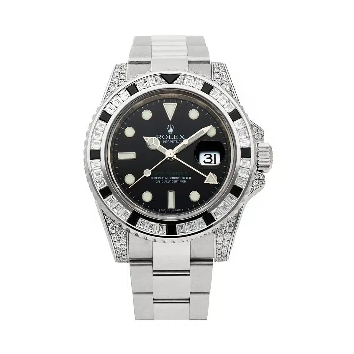 Rolex GMT Master II (ref. 116759SANR) Black Sapphire and Diamond Bezel Black Dial watch features selfwinding movement; black dial, black sapphire and diamond bezel, and white gold oyster bracelet; sapphire crystal, and 40 mm white gold case.
