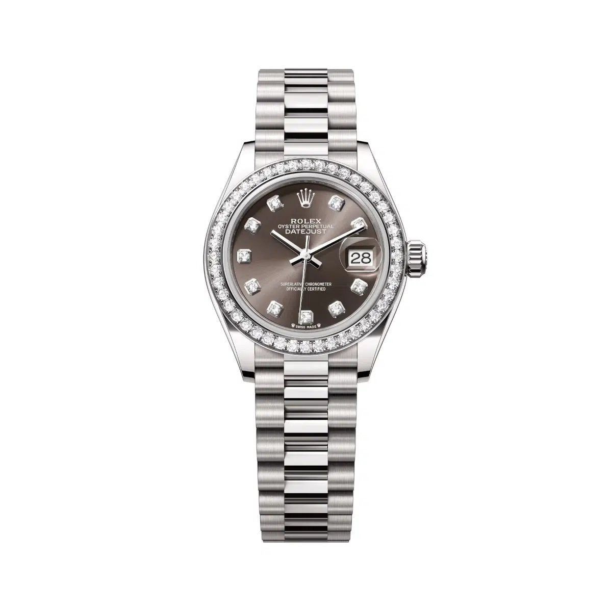 Rolex Lady-Datejust 279139RBR-0011 28mm Dark Grey Set with Diamonds Dial Diamond-Set Bezel 18kt White Gold President Bracelet Watch