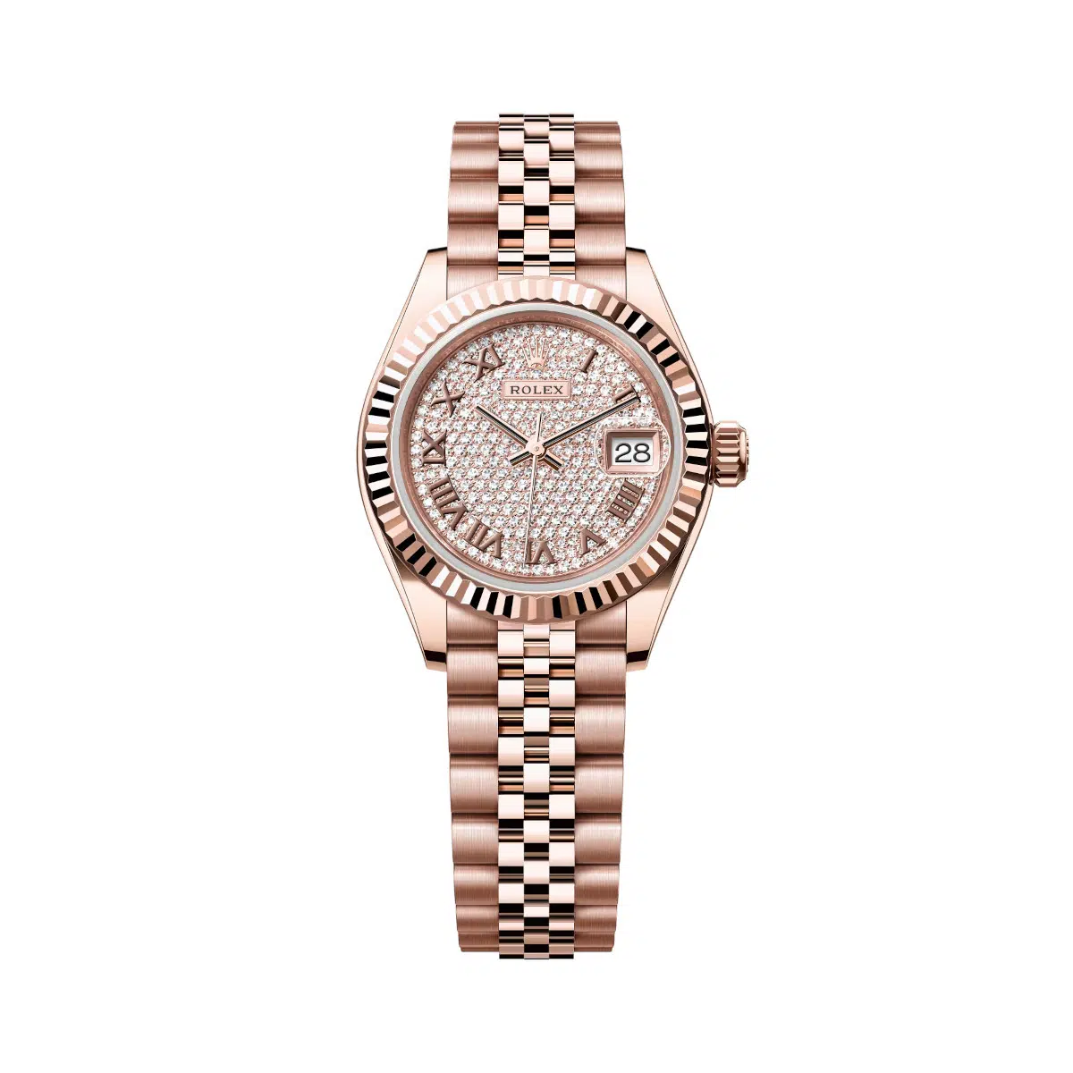 Rolex Lady-Datejust 279175-0024 Diamond-Paved Roman Numeral Dial Fluted Bezel Jubilee Bracelet 18kt Everose Gold Watch