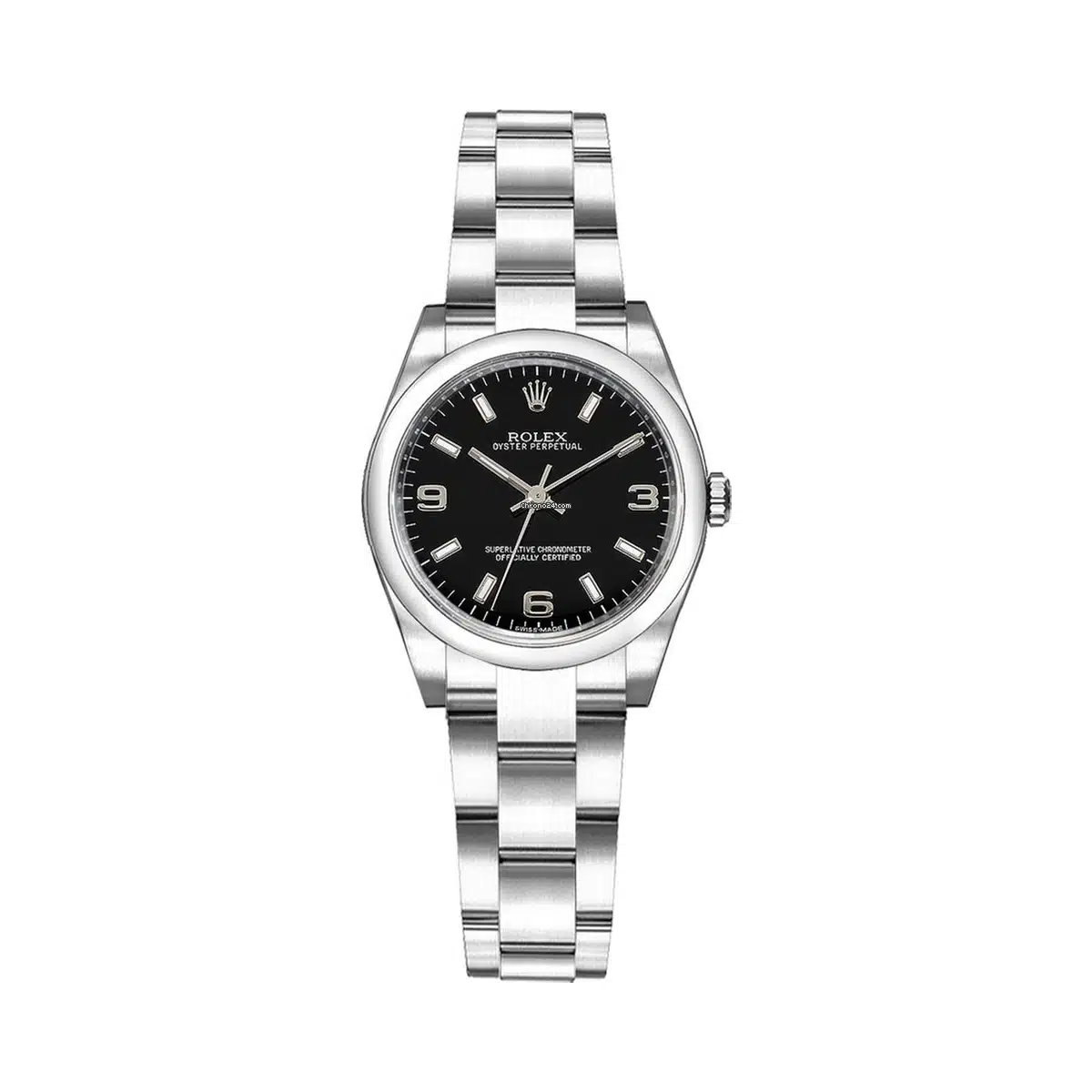 The Rolex Oyster Perpetual 26 (ref. 176200-4) features an automatic movement; black colored with luminescent markers arabic numerals dial; sapphire-crystal, transparent case back; and 26 mm, polished steel case on a polished steel strap with a polished steel folding clasp.